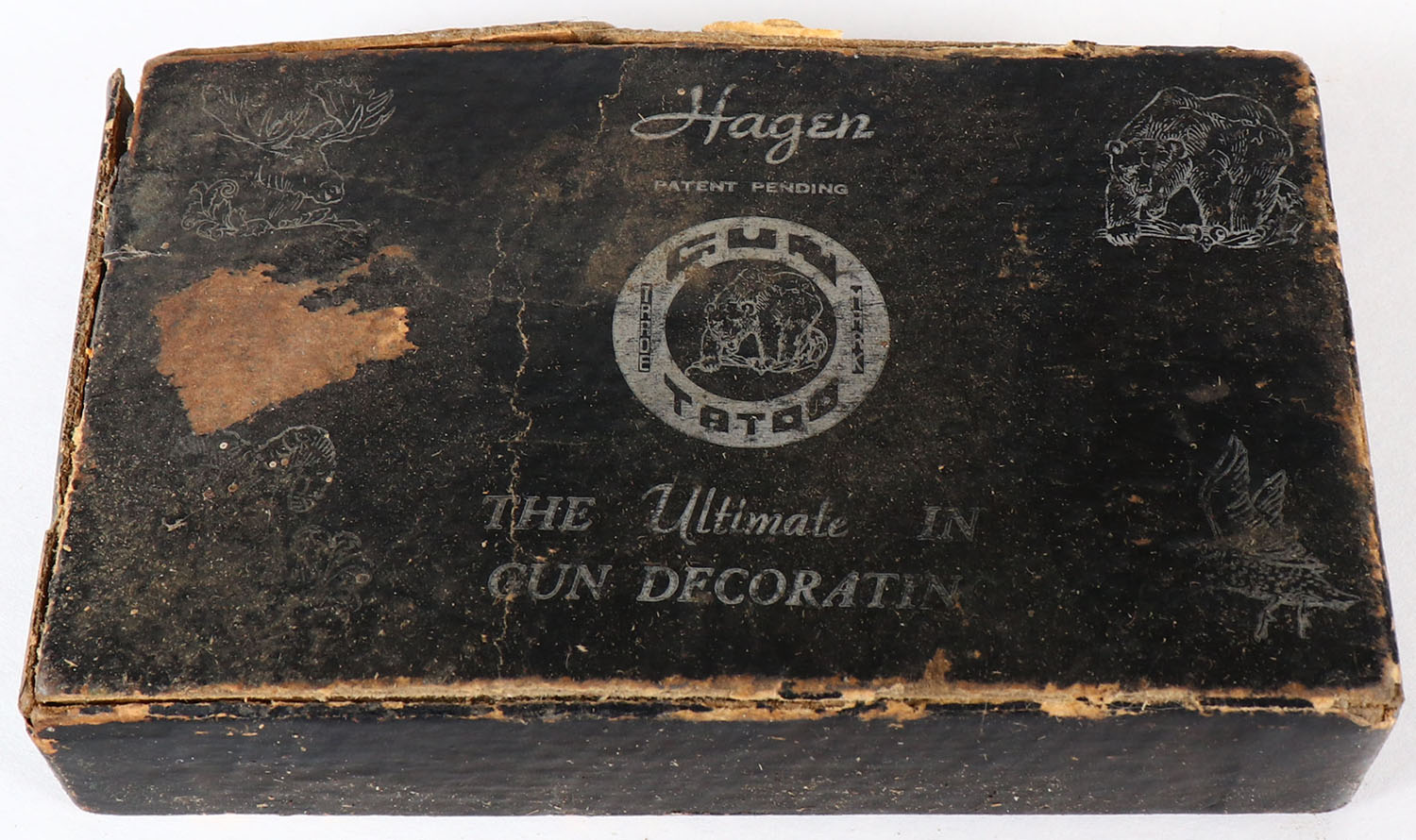 Early gun oil, Hagen The ultimate in Gun decoration, in original cardboard box, 3 FULL jars. Grade: Very Good + - Value: 20 to 60