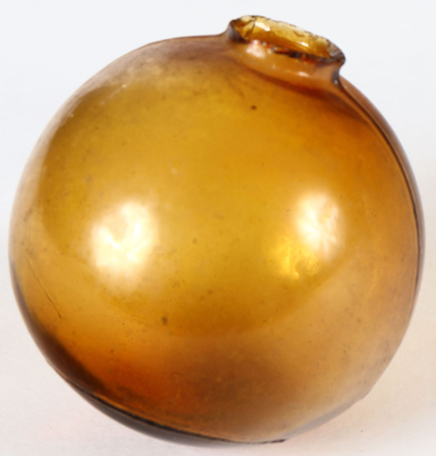 RARE! Amber Glass Target Ball, smooth design, 3 piece, small neck, some foggy glass. Grade: Very Good ++ - Value: 100 to 500