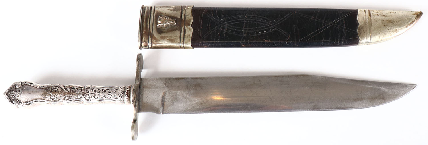 RARE! EARLY! ''J. English & Hubers Sheffield'' Bowie Knife, full hilt, metal handle, 11'' blade, has orignal leather and metal sheath!, Still very solid. Grade: Excellent - Value: 500 to 2000