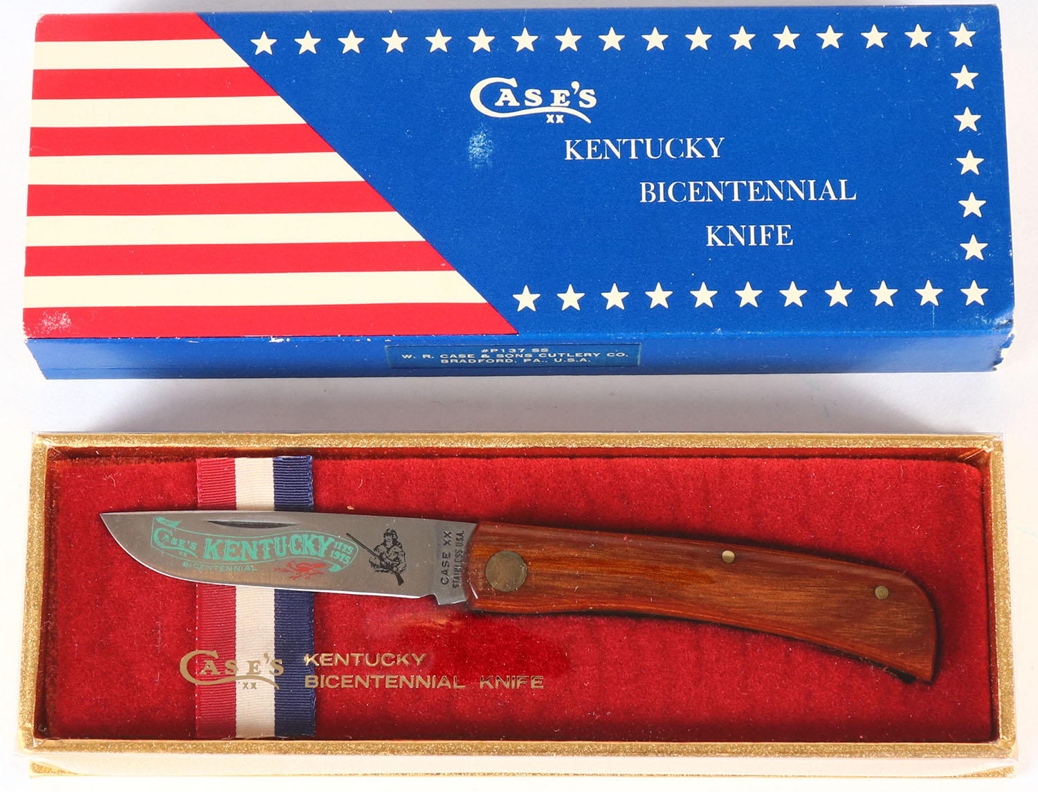 RARE! Case Kentucky Bicentennial knife, wood handle 3'' blade, has display box. Grade: Excellent - Value: 20 to 60