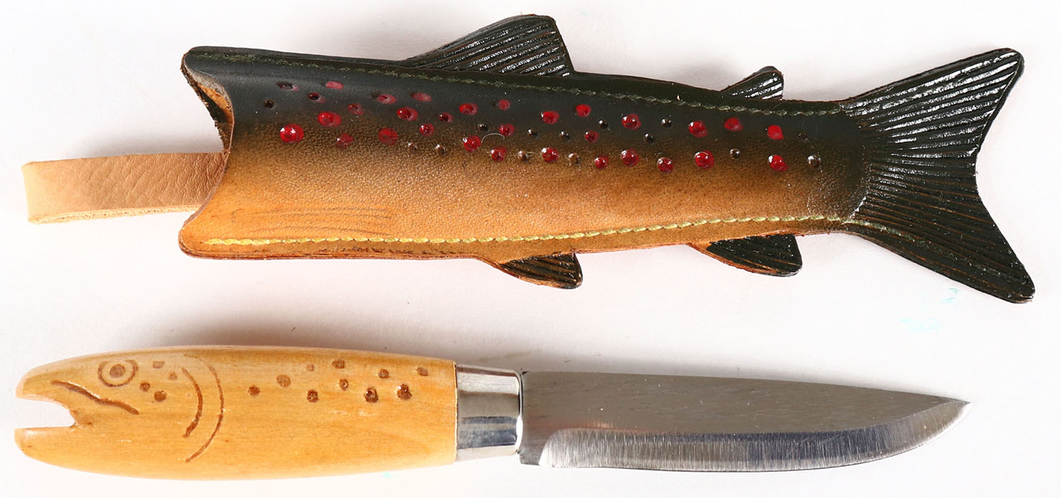 Vintage Swedish fish knife, 2 1/2'' blade, in leather fish shaped sheath, solid and clean. Grade: Excellent ++ - Value: 16 to 60