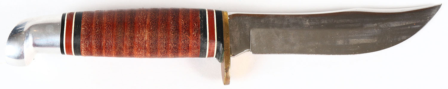 Western fixed blade knife, 4 1/2'' blade, half hilt, wood handle, aluminum pommel. Grade: Excellent - Value: 16 to 60