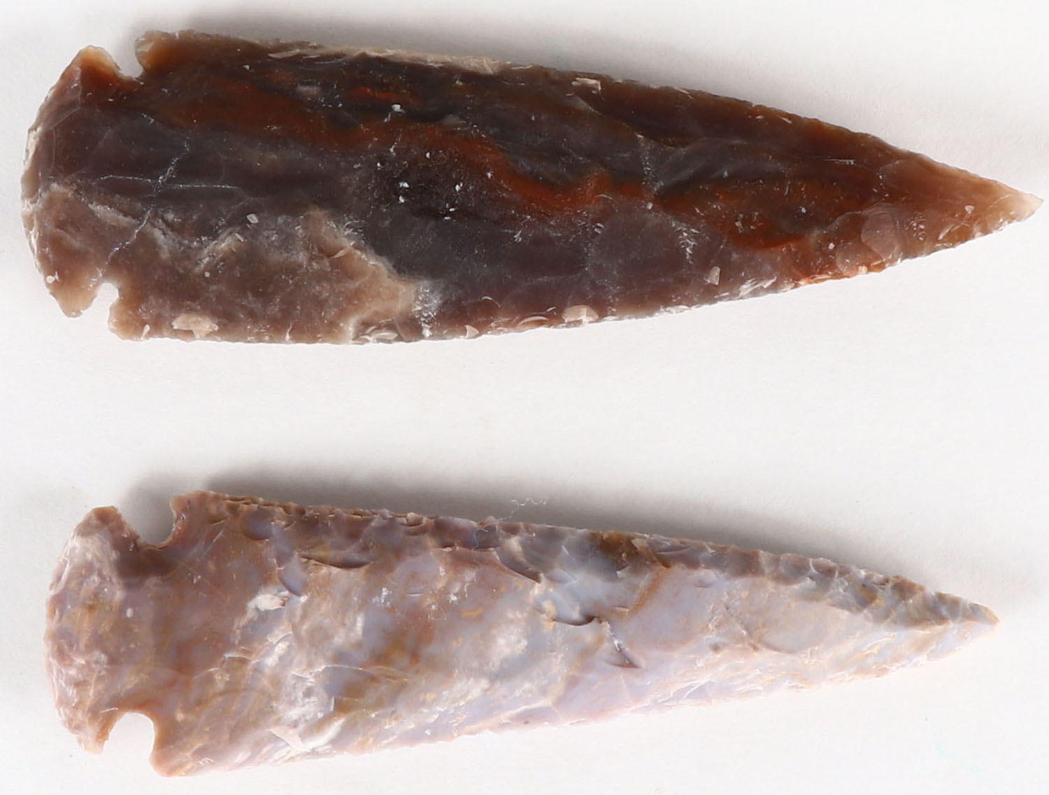 Lot of 2 large flint spearheads, both about 5''. Grade: Excellent - Value: 60 to 160