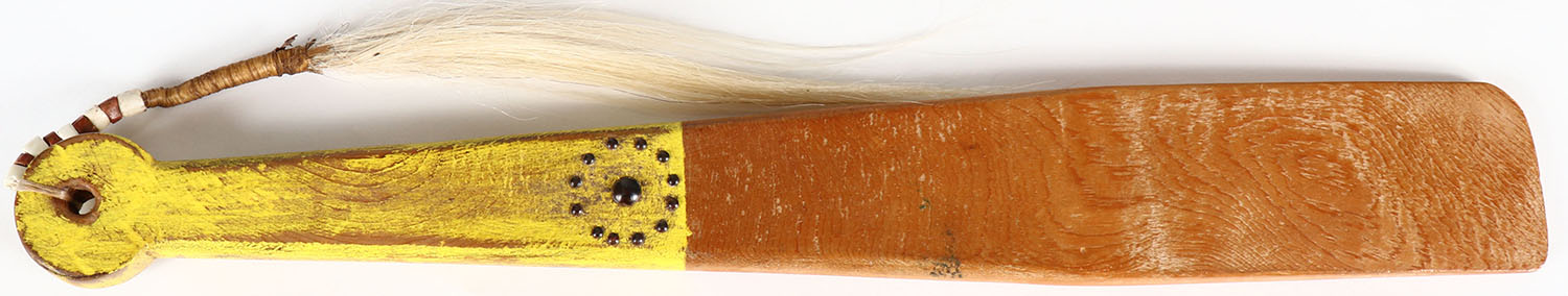 Plains Indian riding quirt circa 1890 trade beads, sinew, brass tacking both sides, white horse hair drop. Grade: Excellent - Value: 20 to 500