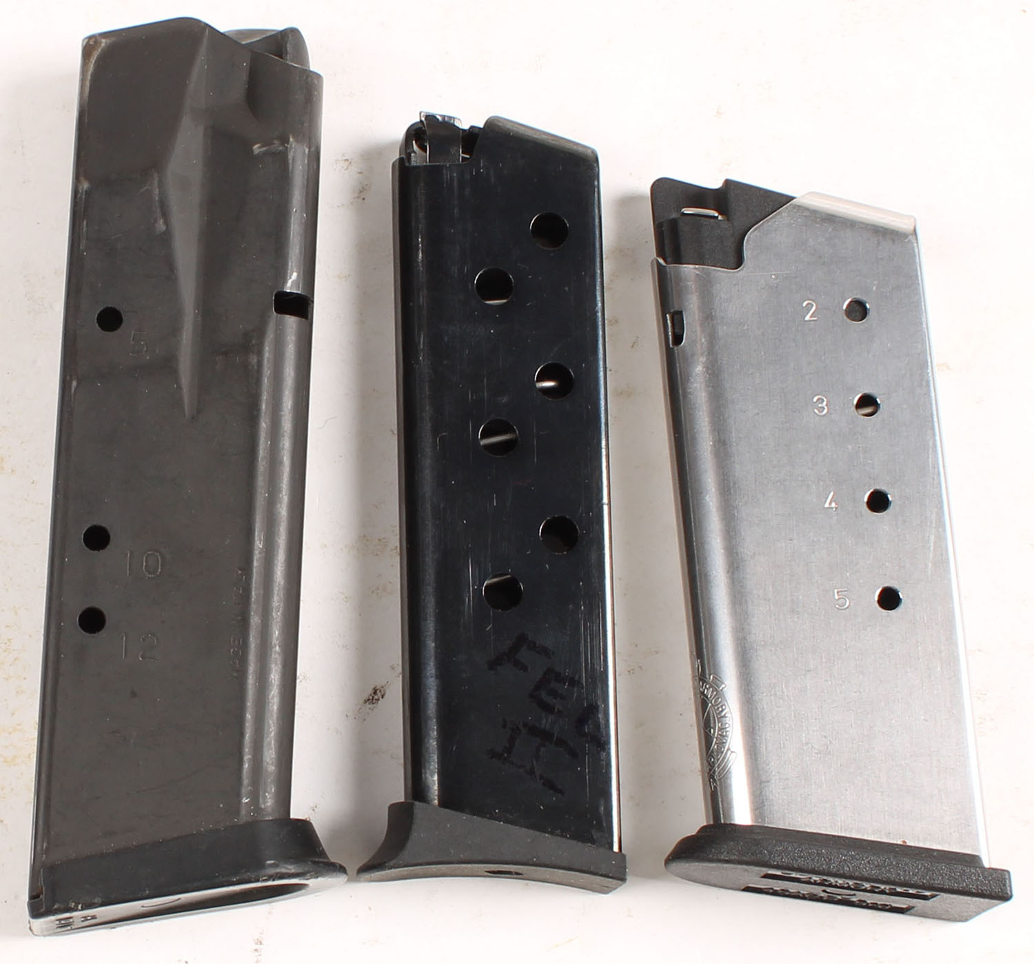 Lot of three Mixed mags, one Springfield XDS 5Rd .45 ACP mag, one military & police marked, Sig P229 .40 cal & .357 Cal, 12 Rd. mag, & one unmarked .380 mag. Grade: Excellent - Value: 20 to 40