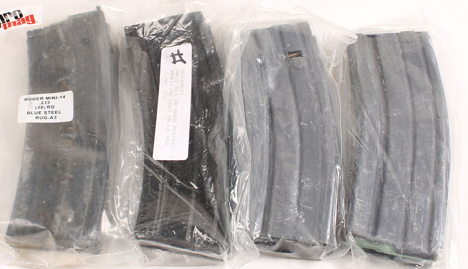 Lot of Four Mags, one H&K AR-15 steel mag, & Two Colt AR-15 aluminum mags, & one Ruger Mini-14 steel mag, all 30Rd. 5.56/.223 Mags., all in original packaging. Grade: Excellent + - Value: 30 to 60