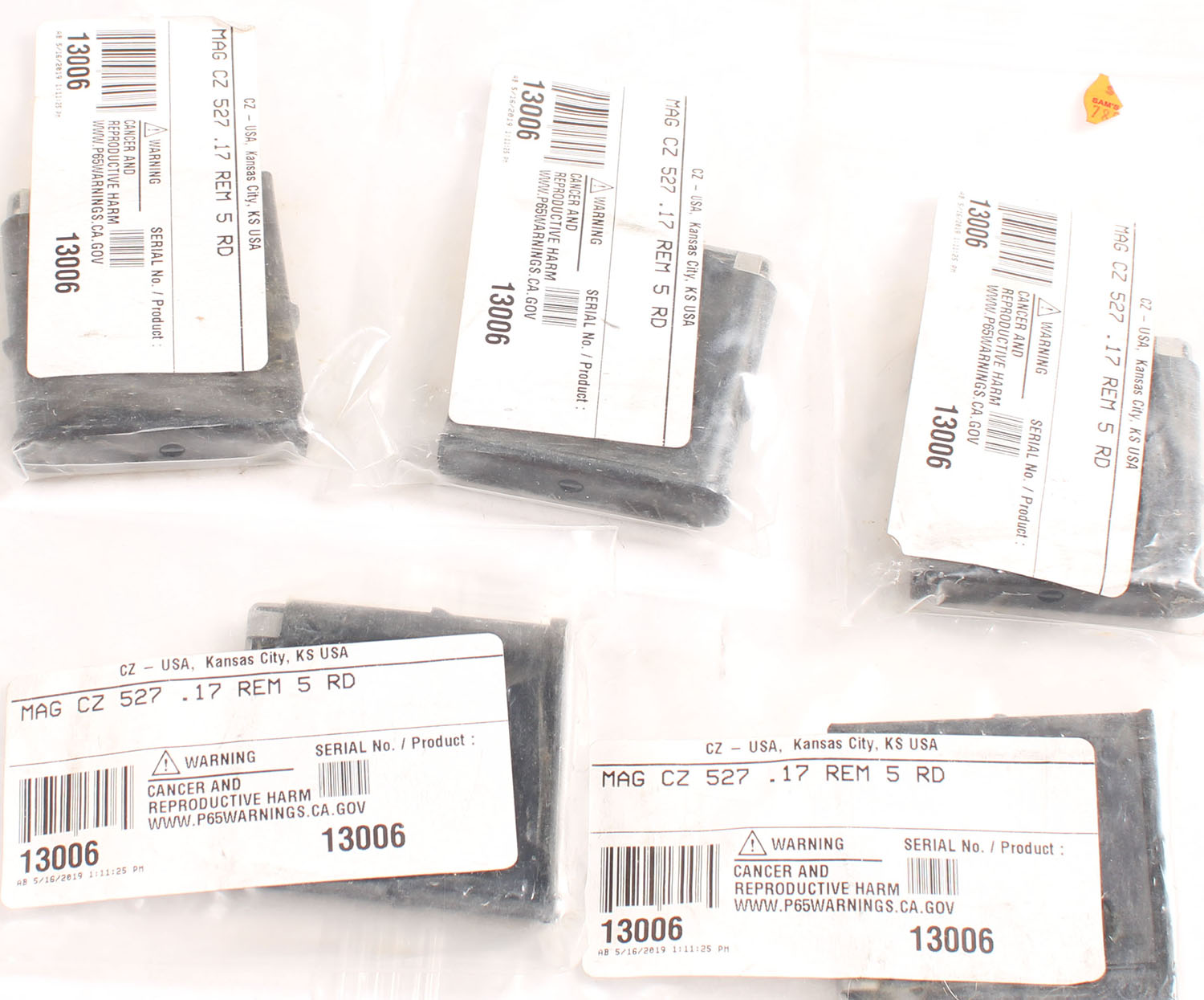 Lot of five, CZ 527 .17 Rem 5Rd. Mags, in original packaging. Grade: Excellent + - Value: 100 to 250