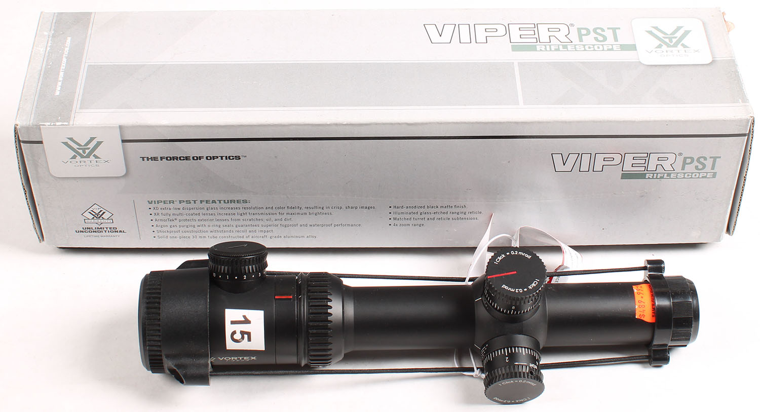 Vortex, Viper PST , 1-4 x 24mm, Low- Power Variable Magnification Rifle Scope, NIB, 30mm Tube Diameter, Second Focal Plane TMCQ (MRAD) Illuminated Reticle, Fixed Parallax, Fast Focus Eyepiece, Nitrogen Gas Purged Aluminum Housing, Waterproof, Fog proof, Shock Proof, 9.7'' Inches long, weighs 18.4 Ounces, Tall Height turrets, 1/5 MRAD clicks are audible and positive, Fully Multi-Coated Glass, comes with CR2023 Battery, cleaning cloth, and Vortex's unbeatable Unconditional Lifetime Warranty. Gade: MINT - Value: 200 to 400