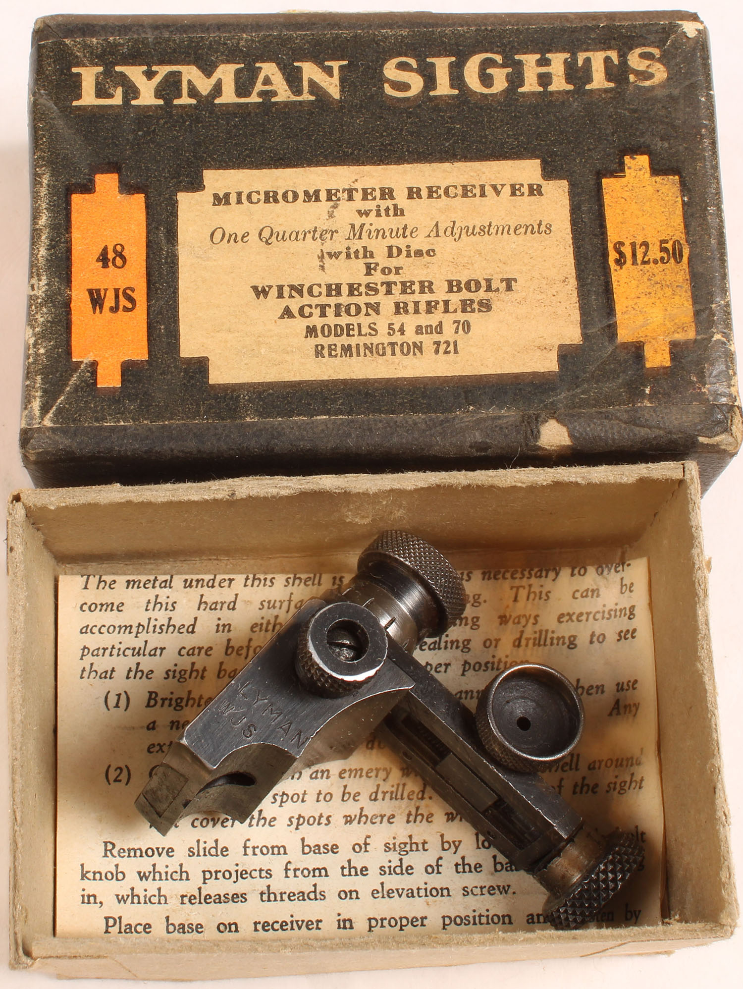 Lyman No 48 WJS sight, for Win bolt action rifles, in orignal box. Grade: Excellent - Value: 100 to 300