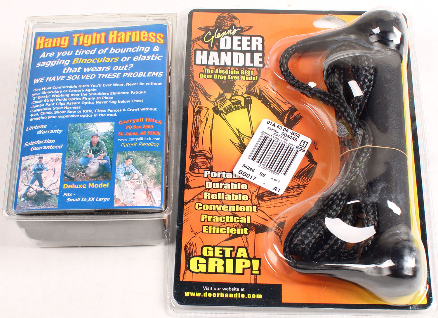 Lot of 2 Deer hunter lot, binoculars harness and deer drag handle. Grade: Excellent - Value: 4 to 40