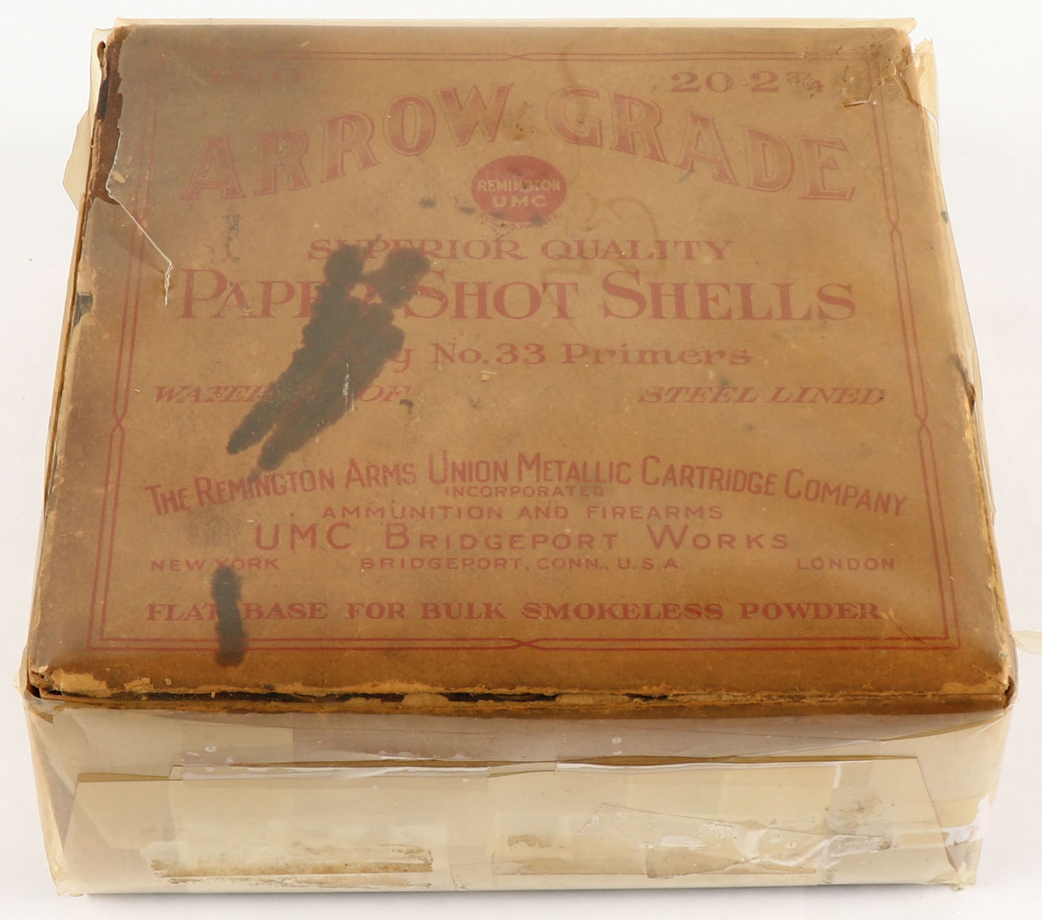 REM-UMC, Arrow Grade, 20ga., 2pc.. Full 100ct. NPE, 2 3/4'', buff box with red and buff label, box has age soiling with seam splits to top & bottom, shells are very good. Grade: Very Good - Value: 150 to 450