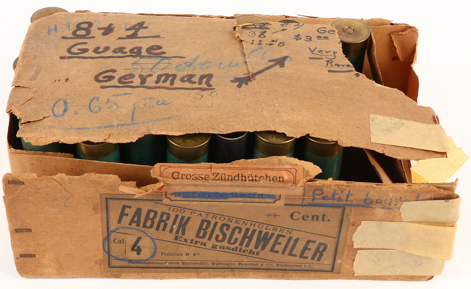 FABRIK BISCHWEILER 100ct. NPE, 4ga., 1pc., Appears Partial 36rds., buff box with label to side, box is torn with missing pieces, has writing on side, Shells are excellent. Grade: Good - Value: 50 to 500