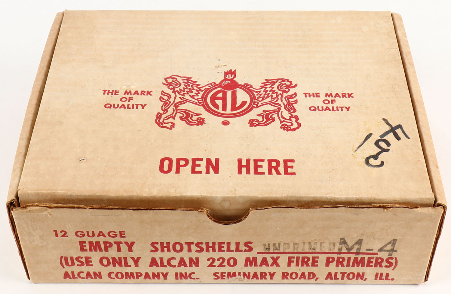 ALCAN 100ct. Box, 12ga., Empty Shotshells Unprimed, Full, buff box with red print, box is solid with very light age soiling, Shells are good. Grade: Very Good - Value: 100 to 500