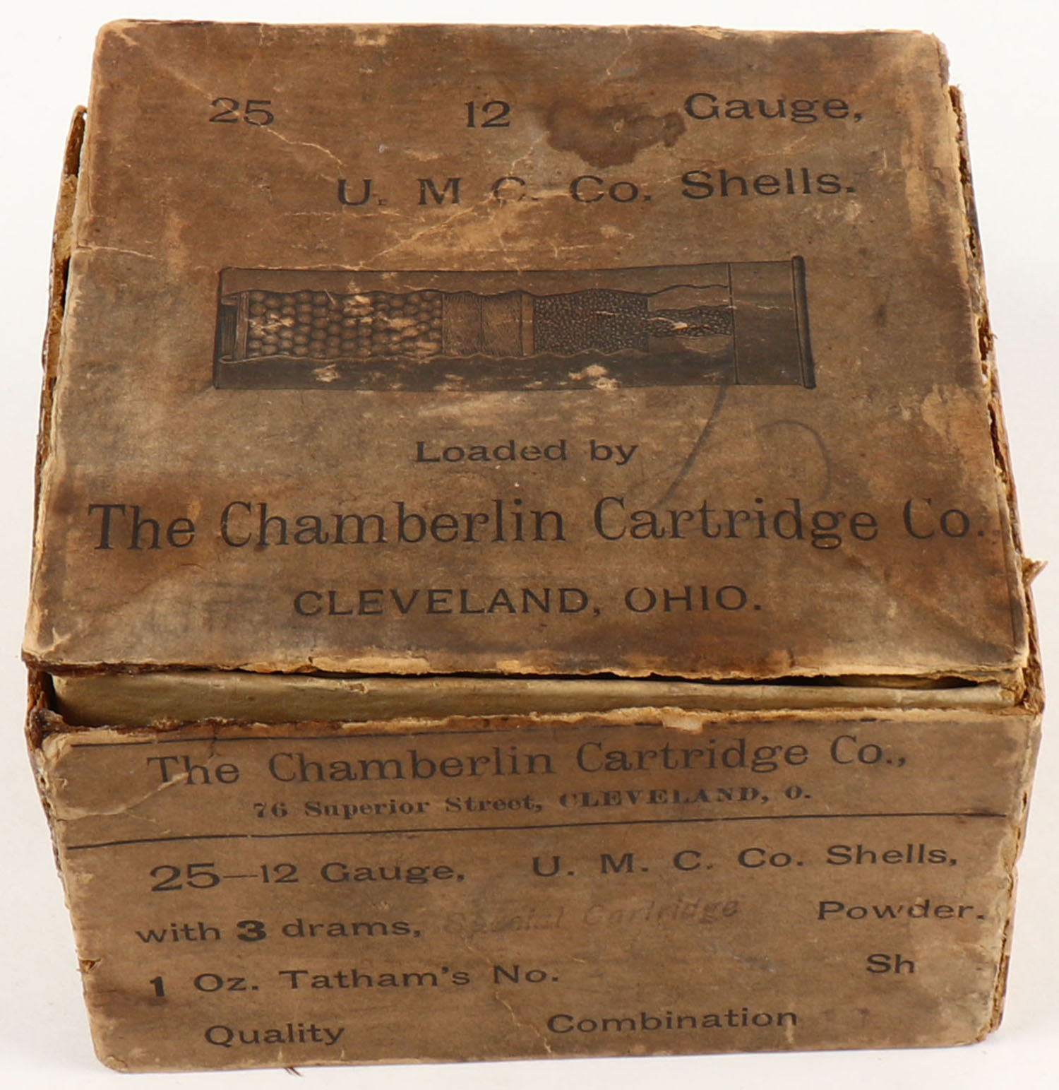 Chamberlin Cartridges, 12ga., 2pc., Full, shot size 6, shells headstamped U.M.C.Co. No 12, buff box with buff & black label, box has age soiling & scuffing, box has seam splits, Shells are very good. Grade: Very Good - Value: 300 to 500