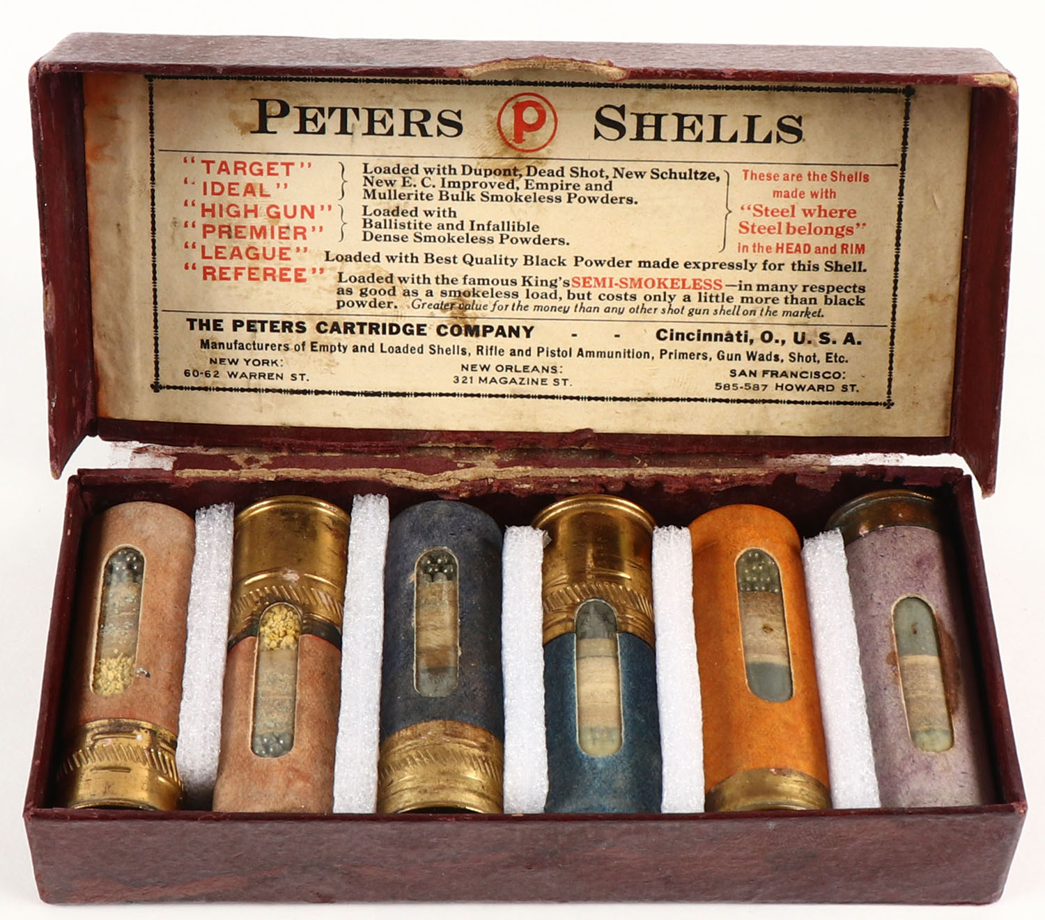 Peter's Salesman Sample Kit, Full, Displayed shells with those being ''Target'', ''Ideal'', ''High Gun'', ''Premiere'', ''League'', ''Referee'', shells are excellent, box has a tape repair with light scuffing. Grade: Very Good ++ - Value: 100 to 400
