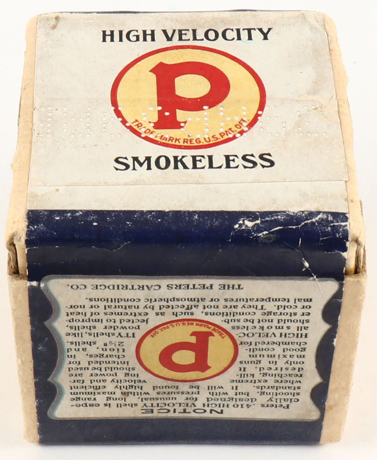 Peters Cart. Co., Blue Wing Teal, 410ga., 2 1/2'', 2pc., FULL & SEALED, shot size 6CH, buff box with multi colored label that pictures Blue Wing Teal in flight, box is very solid with very good label, has light scuffing. Grade: Excellent ++ - Value: 1000 to 3000