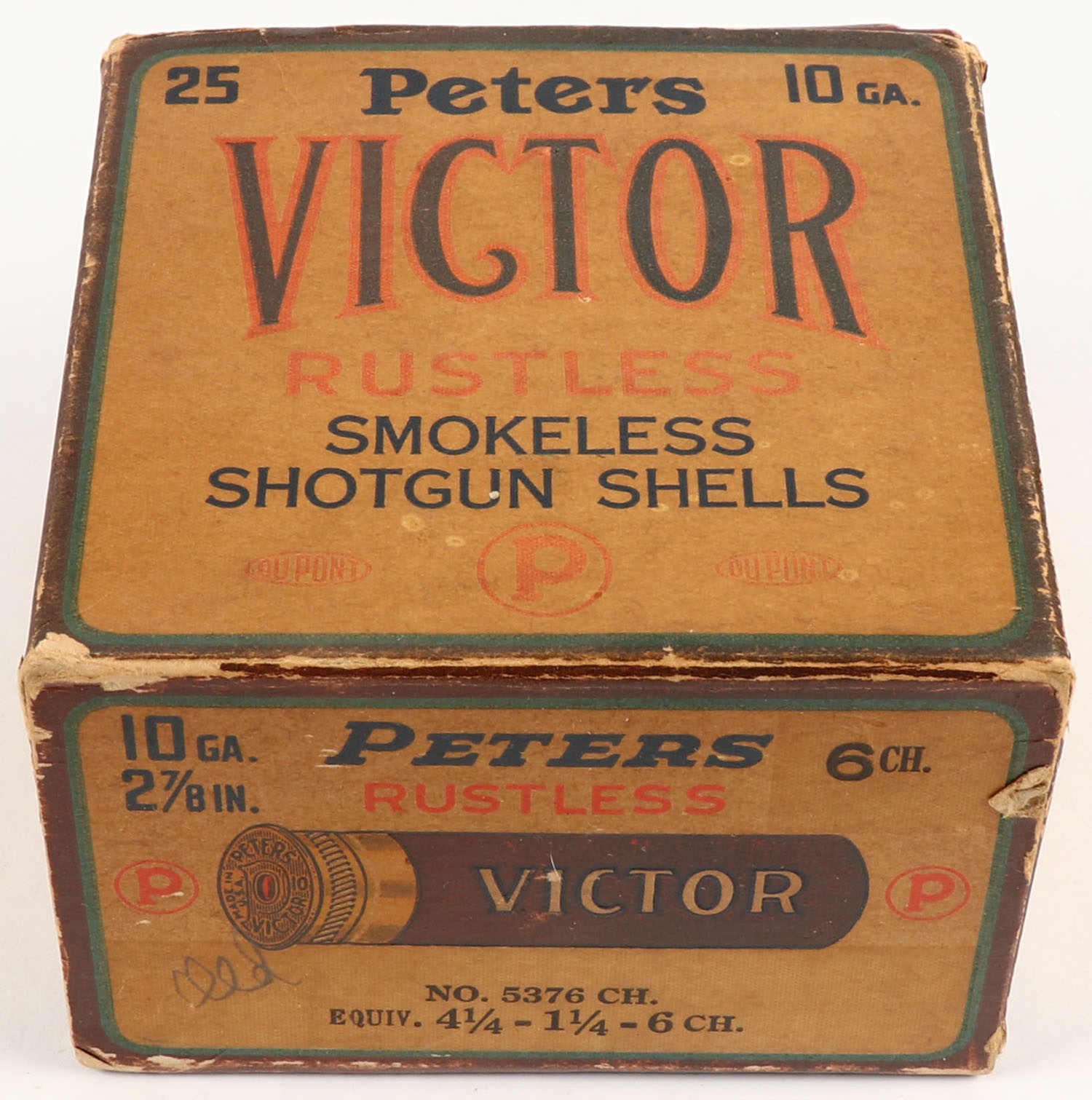 Peters Cart. Div., Victor, Rustless, 10ga., 1pc., Full, shot size 6CH, Maroon, cream & orange box, 2 7/8'', box has light edge wear & light soiling with very nice colors, paper shells are excellent. Grade: Very Good ++ - Value: 50 to 150