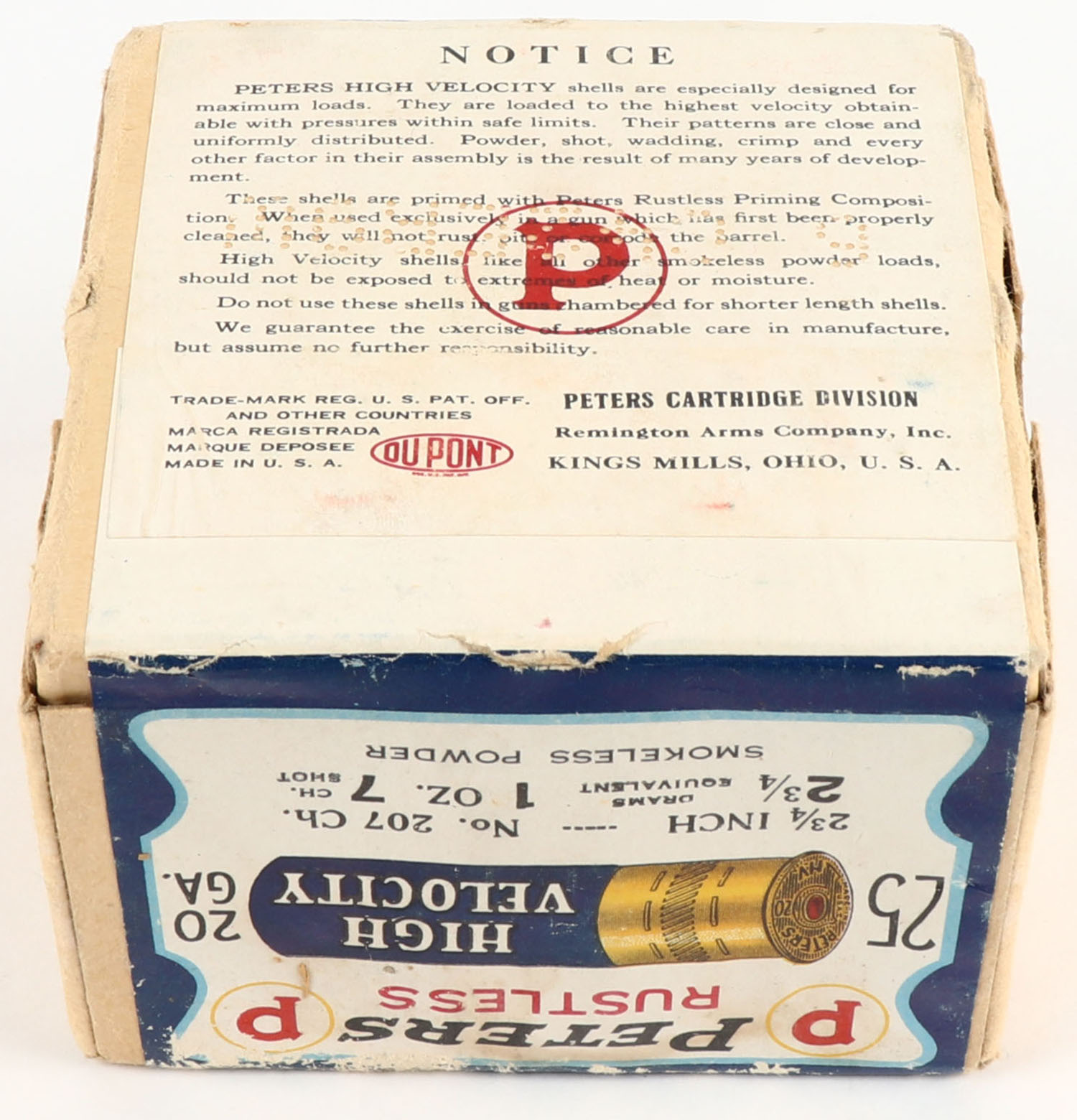 Peters Cart. Co., Blue Bill, 20ga., 2pc., FULL & SEALED, shot size 7CH, buff box with multi colored label that pictures Blue Bill in flight, box has a seam split with edge wear, has light scuffing with great colors. Grade: Very Good ++ - Value: 100 to 300