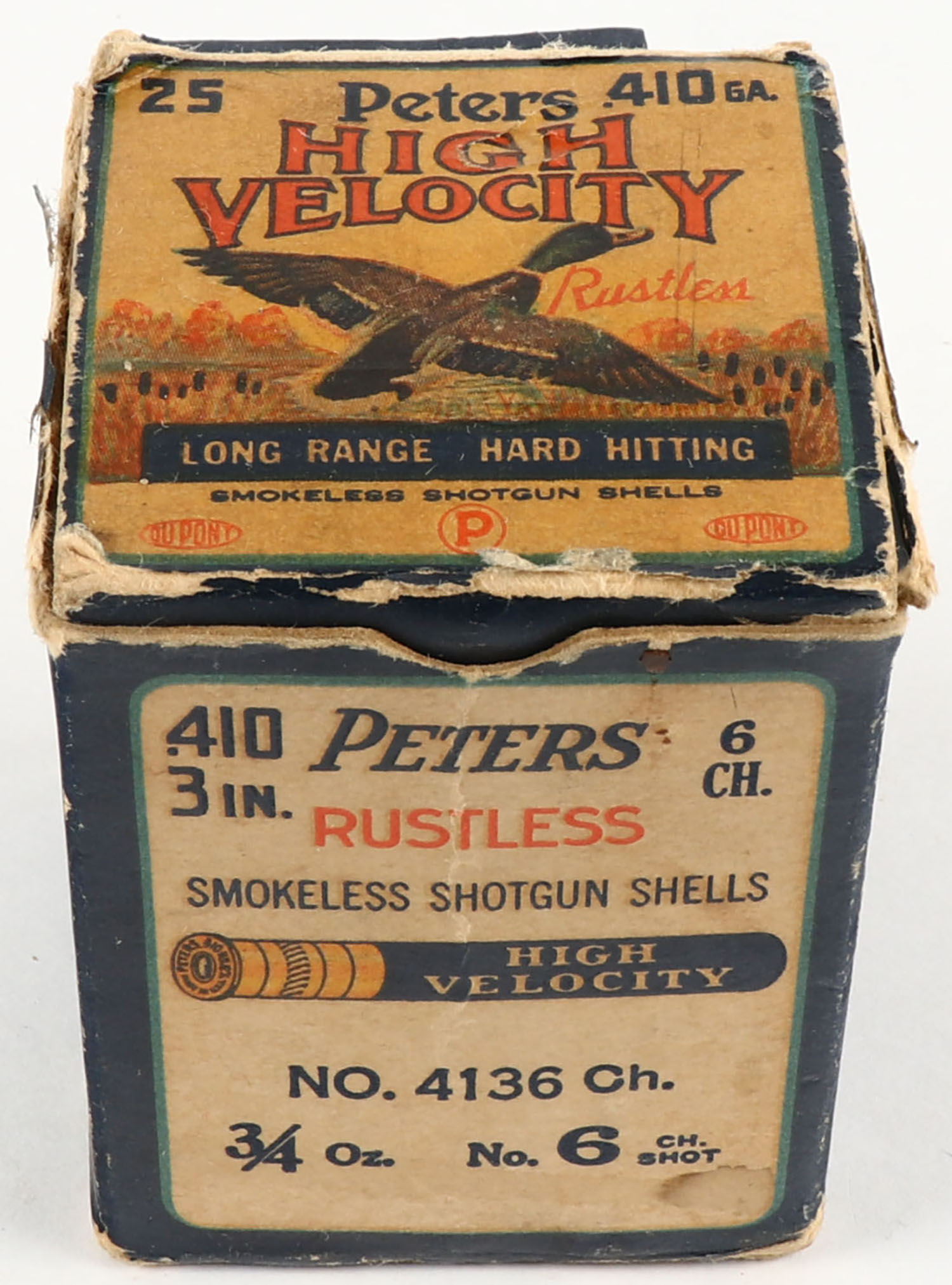 Peters, High Velocity, 410ga., 3'', 1pc., Full, shot size 6CH, multi-colored box with mallard duck flying out of marsh grass, box has a torn top flap, has edge wear with some scuffing, Shells are excellent. Grade: Very Good ++ - Value: 20 to 80