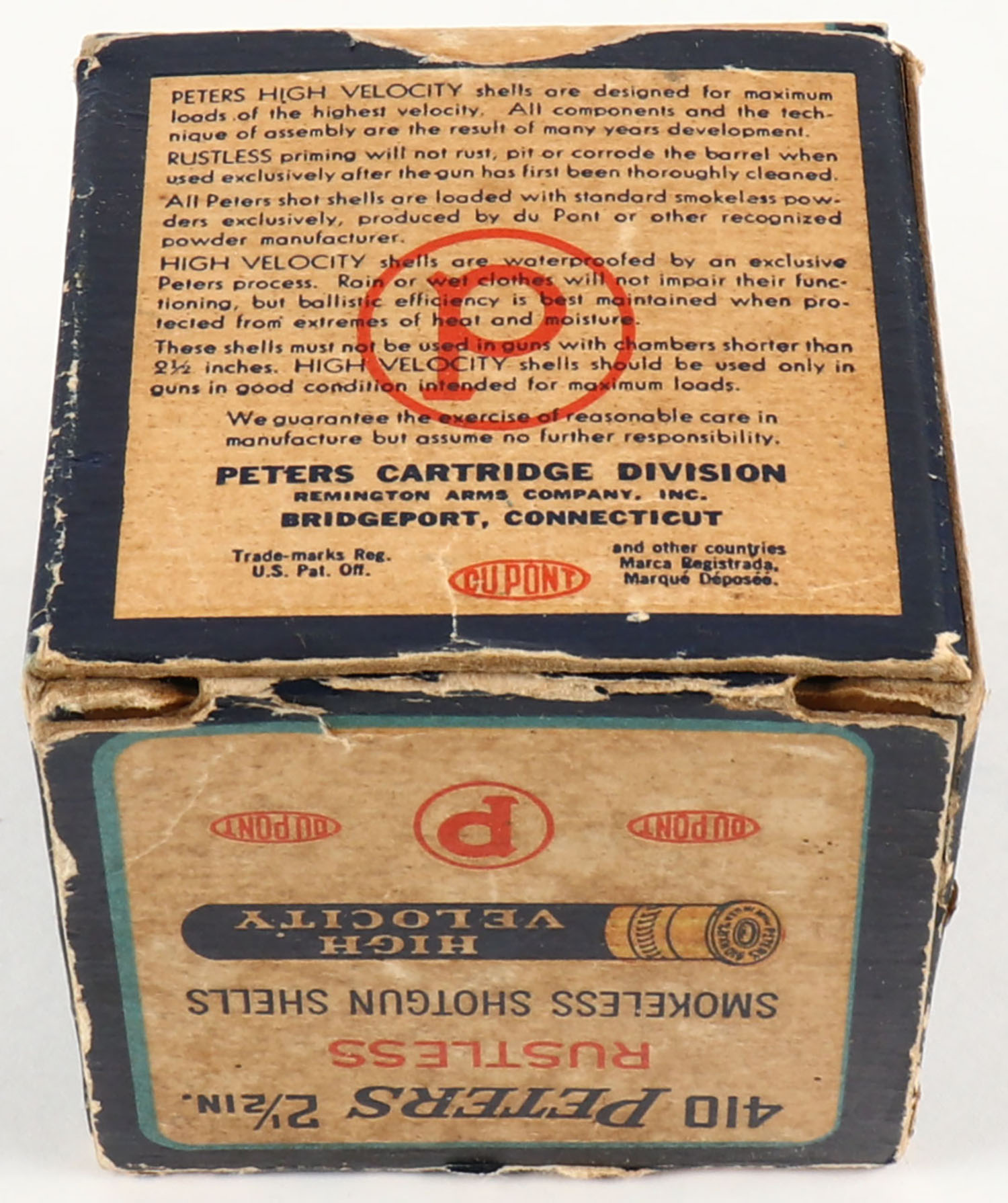 Peters, High Velocity, 410ga., 2 1/2'', 1pc., Full, shot size 5, multi-colored box with mallard duck flying out of marsh grass, box has edge wear with some age soiling, paper shells are excellent. Grade: Very Good + - Value: 40 to 100