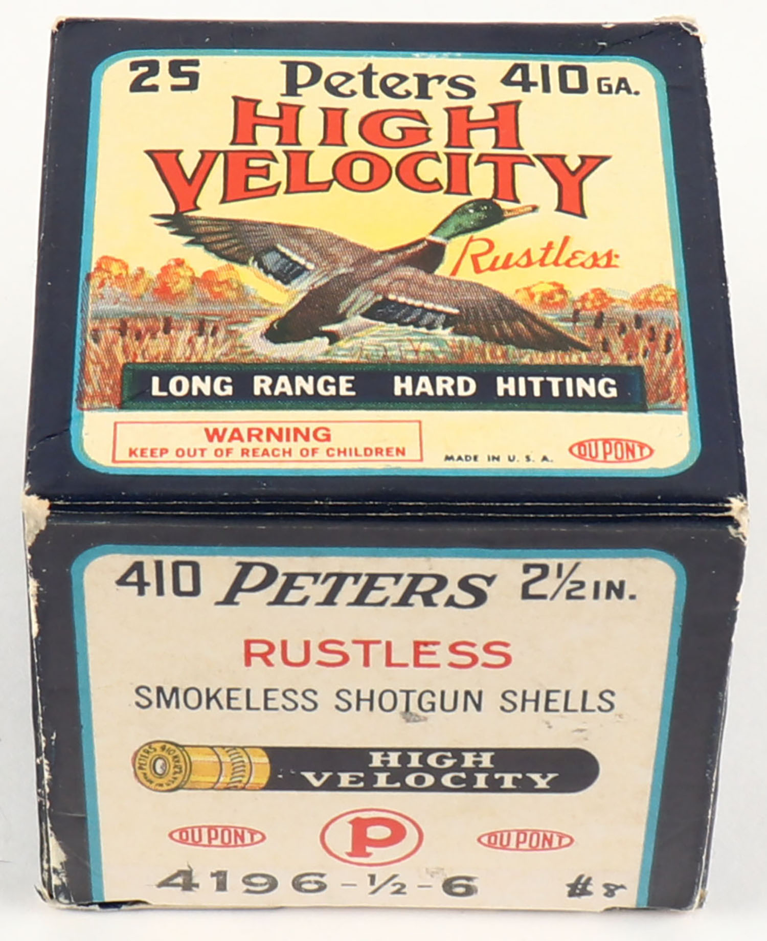 Peters, High Velocity, 410ga., 2 1/2'', 1pc., Full, shot size 6, multi-colored box with mallard duck flying out of marsh grass, box is very solid with excellent colors, paper shells are excellent. Grade: Excellent ++ - Value: 40 to 100