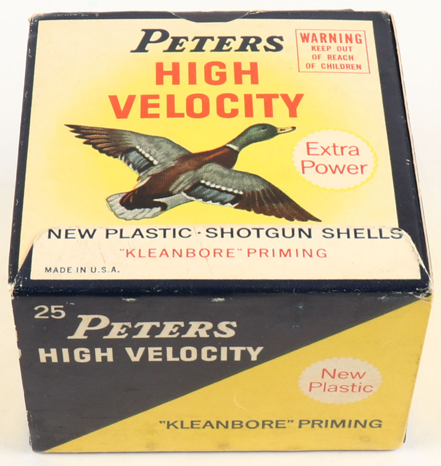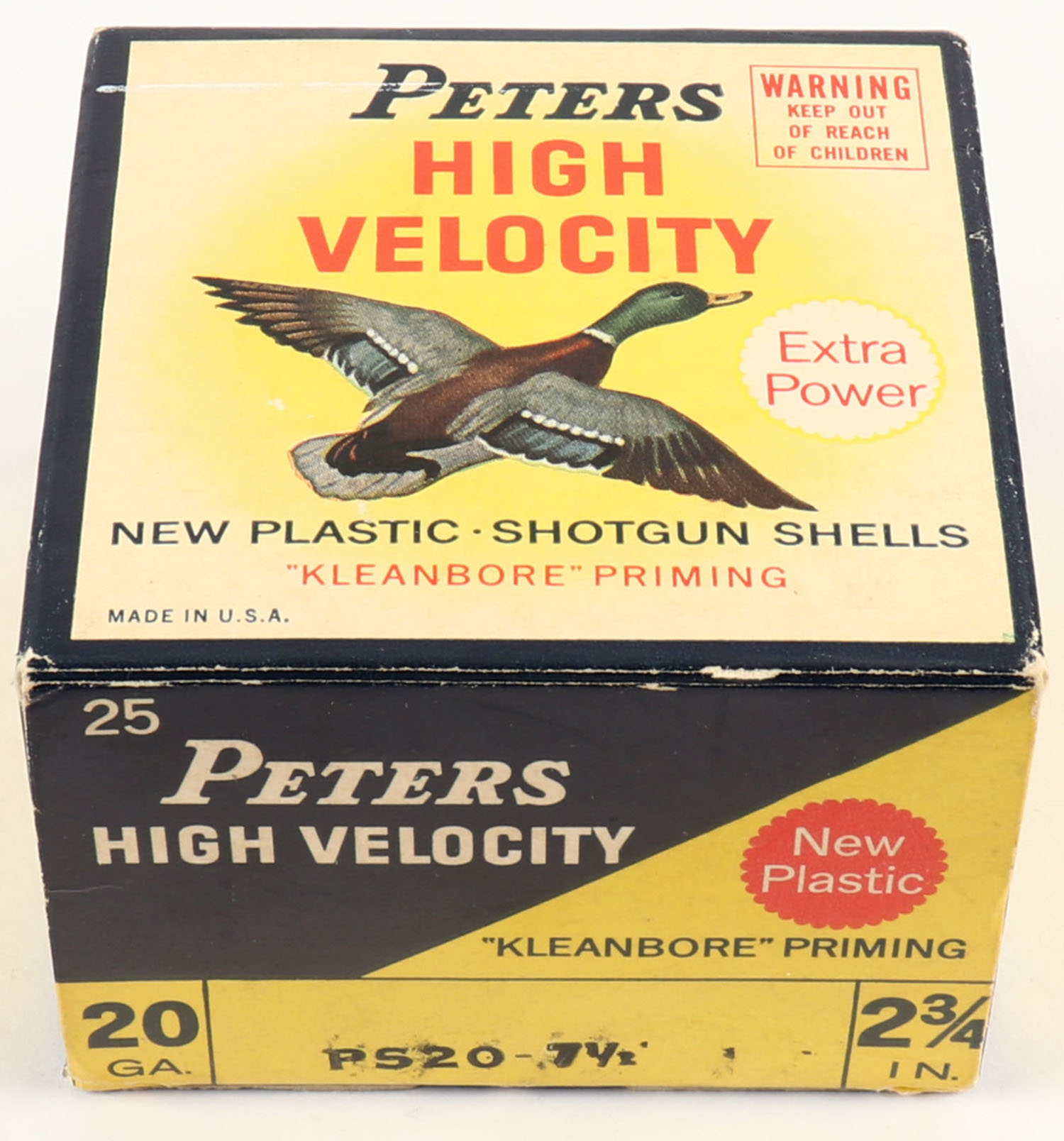 Peters Cart. Co., High Velocity, 20ga, 2 3/4'', 1pc., Full, shot size 7 1/2, multi colored box that pictures mallard flying, box is solid with great color, plastic shells are very good. Grade: Excellent - Value: 10 to 40