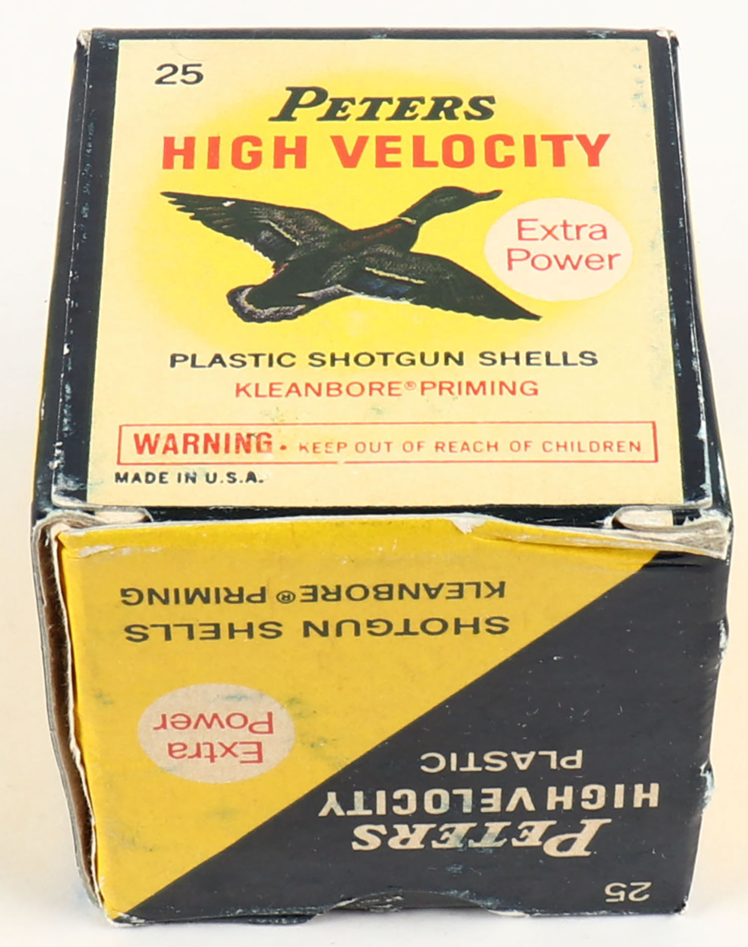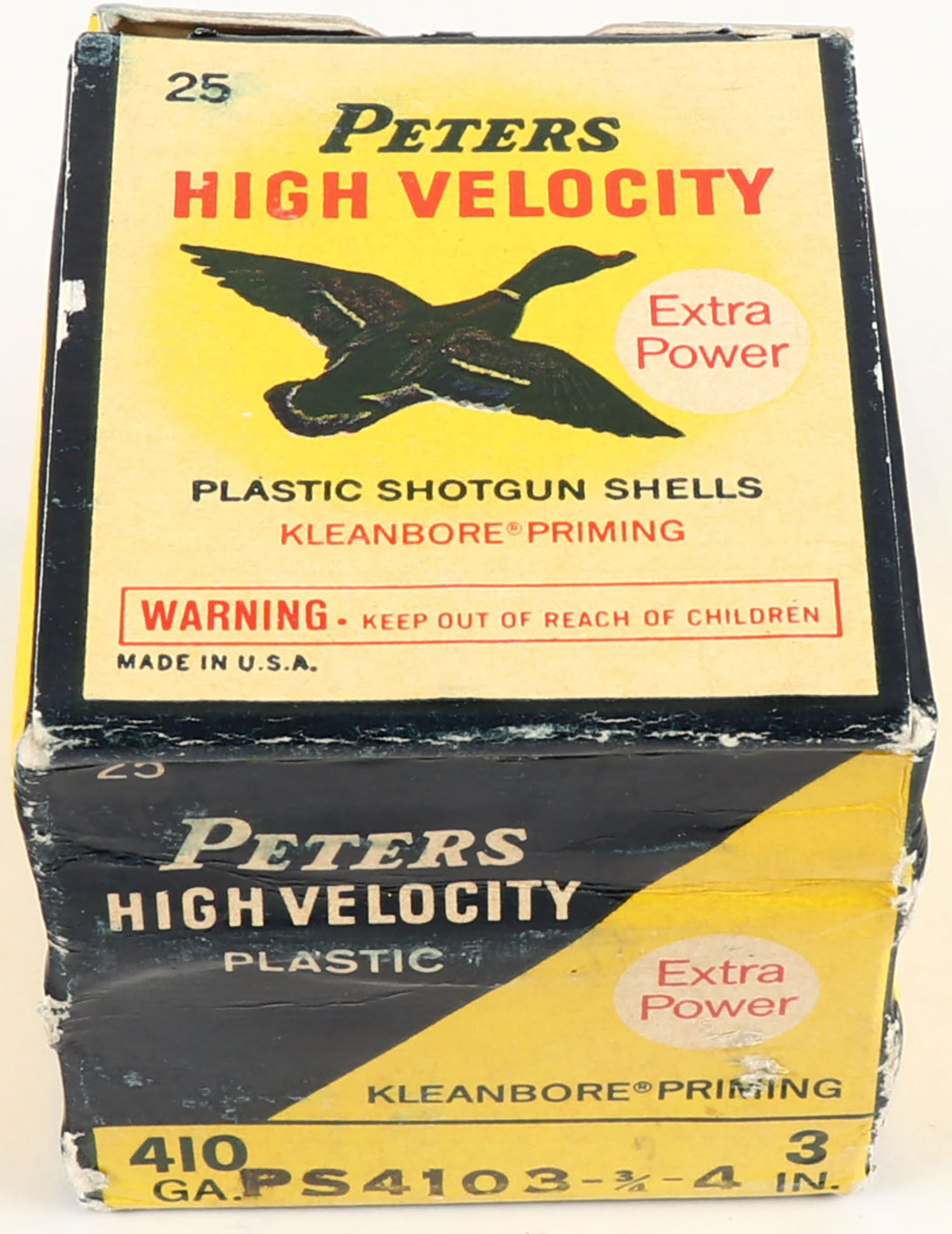 Peters Cart. Co., High Velocity, 410ga, 3'', 1pc., Full, shot size 4, multi colored box that pictures mallard flying, box has a seam split with edge wear, plastic shells are very good. Grade: Very Good + - Value: 10 to 40