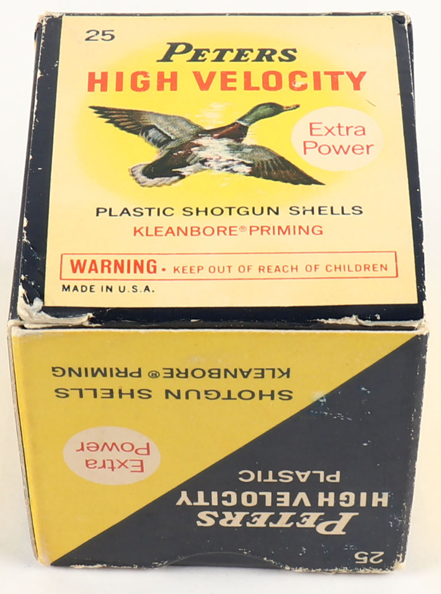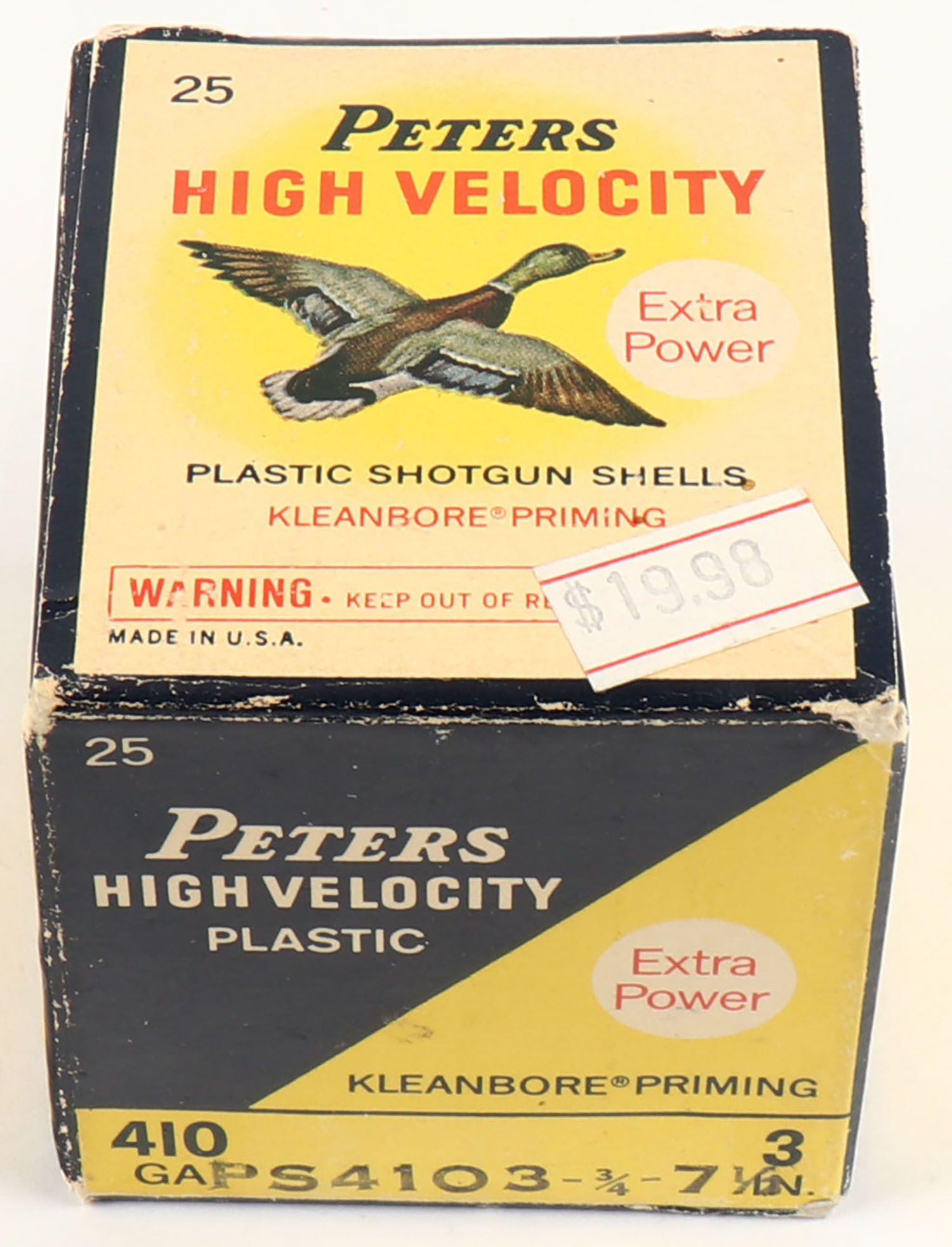Peters Cart. Co., High Velocity, 410ga, 3'', 1pc., Full, shot size 7 1/2, multi colored box that pictures mallard flying, box is solid with some shelf wear, plastic shells are excellent. Grade: Excellent - Value: 10 to 30