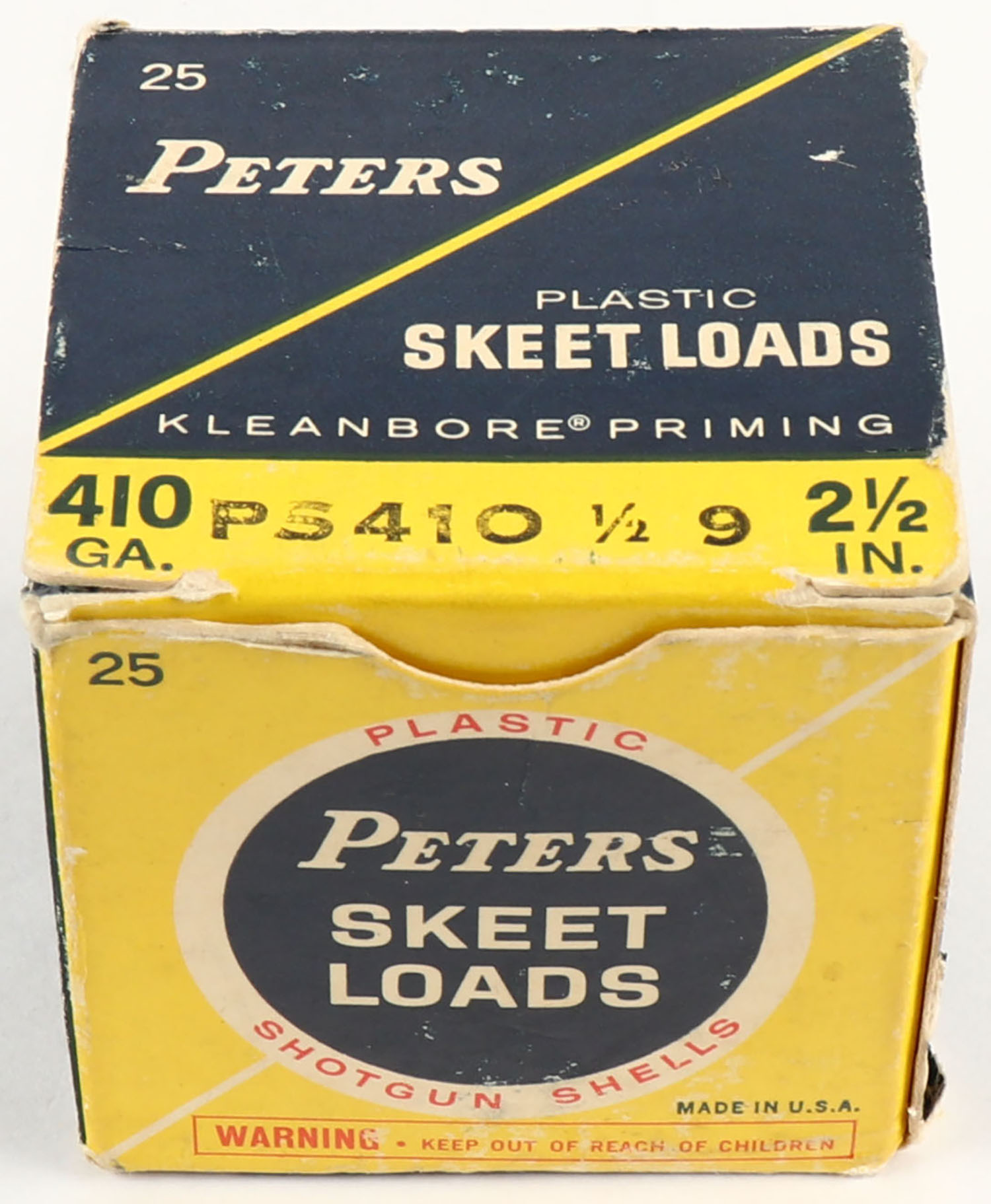 Peters Cart. Div., 410ga, 2 1/2'', 1pc., Full of mixed mfg's, shot size 9, multi colored box, box is very solid, shells are good. Grade: Very Good - Value: 10 to 30