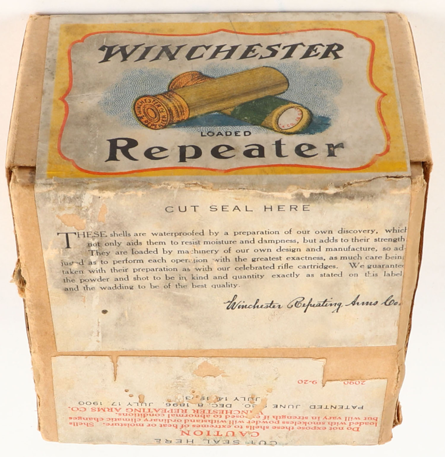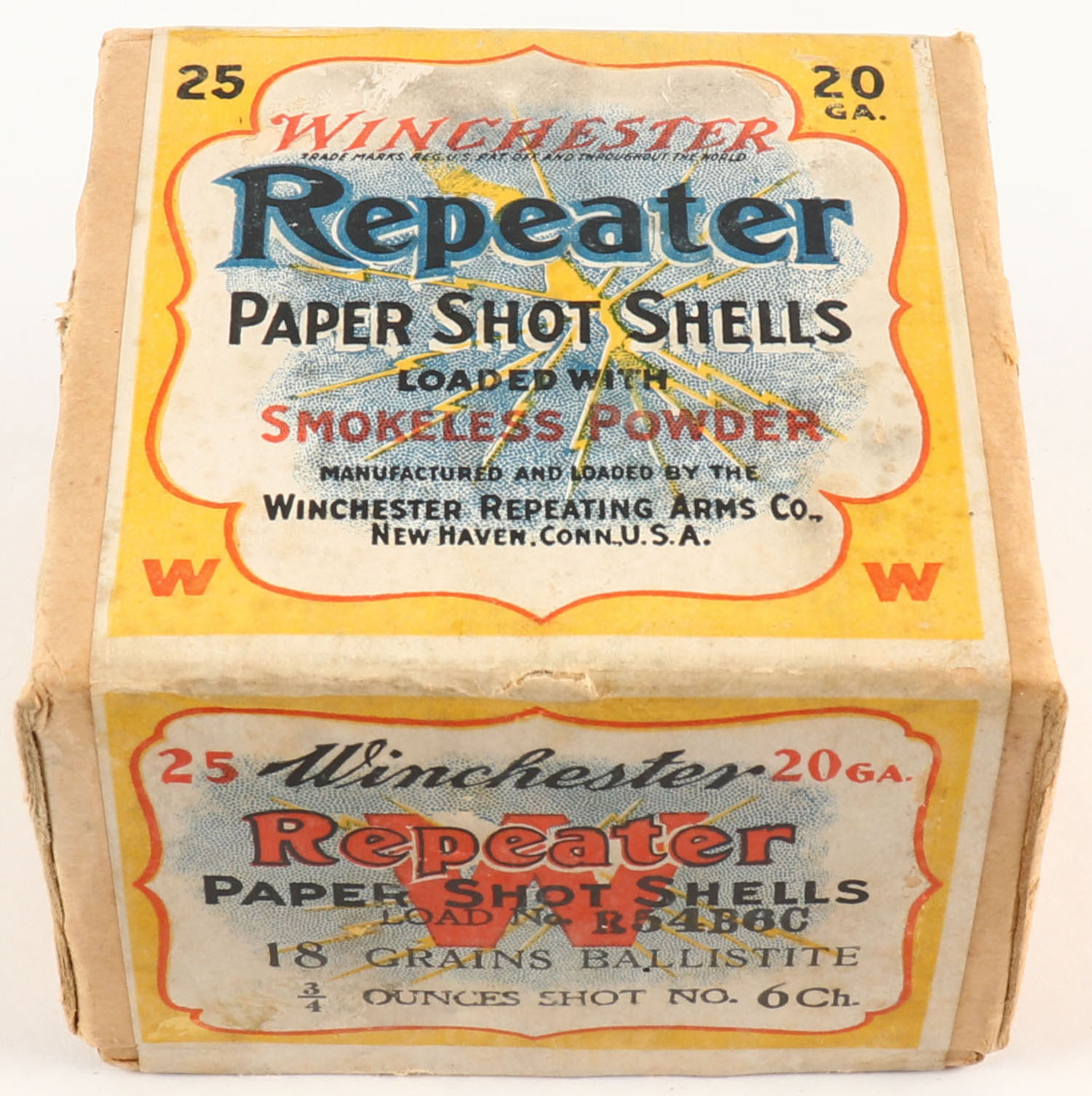 Winchester, REPEATER, 20ga, 2pc., FULL & SEALED, Shot size 6 CH, Buff box with yellow, white & red label showing lightning bolt, box has very light shelf wear, box is very solid with excellent color. Grade: Excellent + - Value: 150 to 400