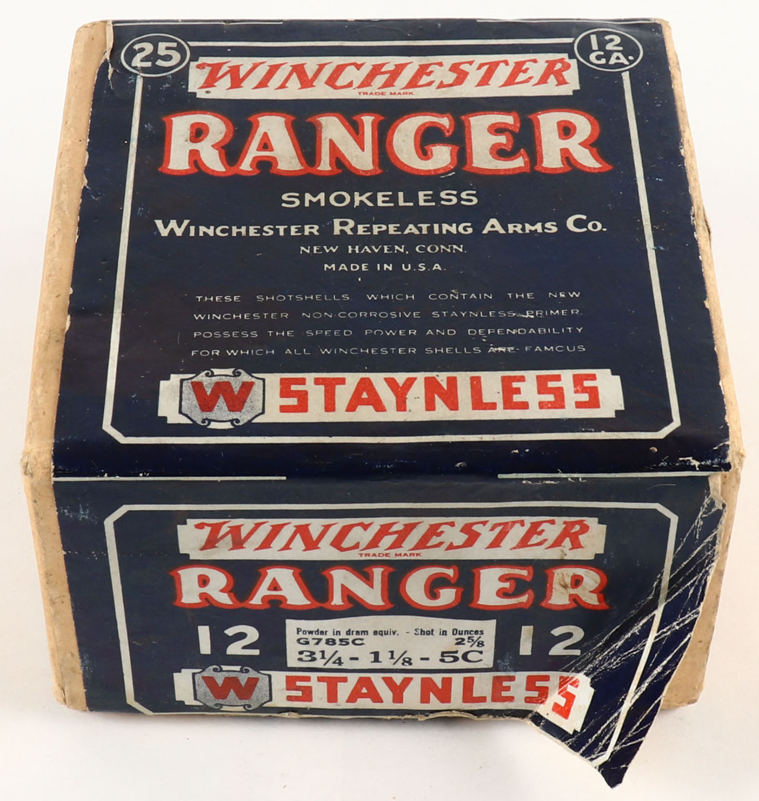 Winchester, Ranger, STAYNLESS, 12ga., 2pc., Partial 23 rds., shot size 5C, buff box with blue, red & white label, box is solid with scuffing to label, paper shells are very good. Grade: Very Good ++ - Value: 40 to 150