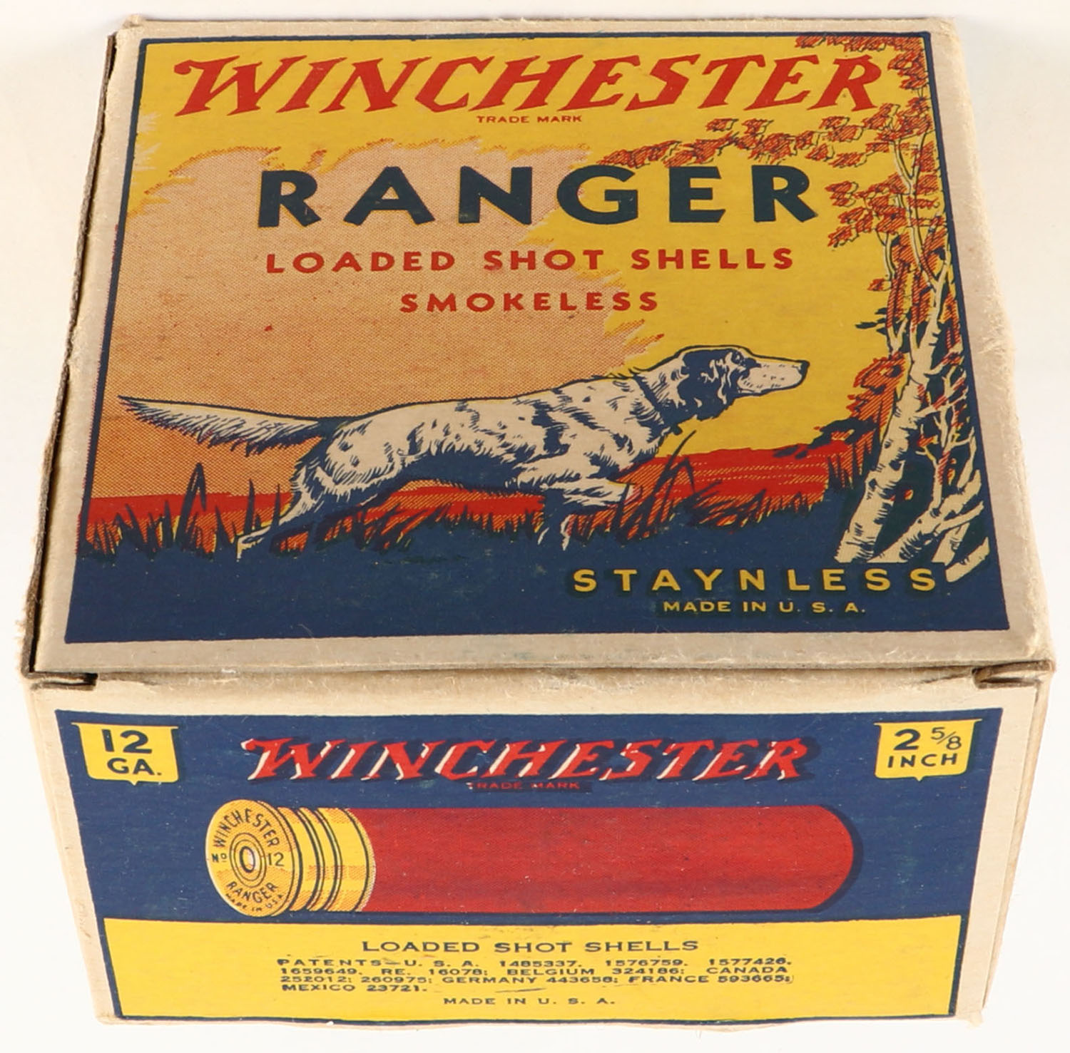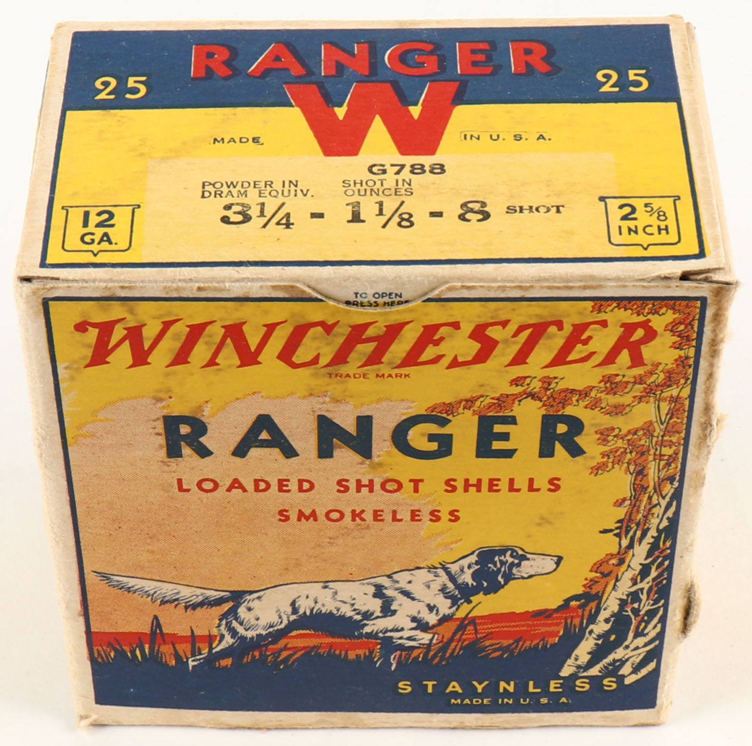 Winchester, Ranger, 12ga, 1pc., Full, Shot Size 8, multi colored box, dog on point, 2 5/8'', box has minor shell protrusions with very nice colors, shells are excellent. Grade: Excellent - Value: 40 to 100