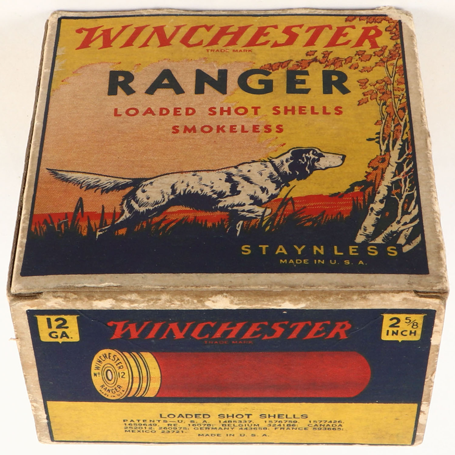 Winchester, Ranger, 12ga, 1pc., Empty, Shot Size 7 1/2 Chilled, multi colored box, dog on point, 2 5/8'', box has light scuffing with very nice colors. Grade: Very Good ++ - Value: 20 to 60