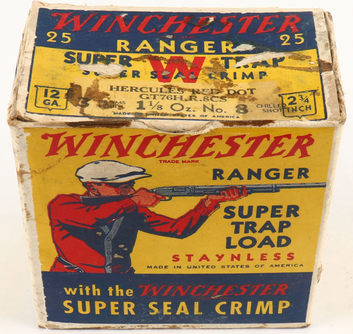 Winchester, Ranger SUPER TRAP LOAD, 12ga., 1pc., Partial 10rds., Hercules Red Dot, shot size 8 Chilled Shot, yellow, blue & red box that pictures trap shooter, box has scuffing & edge wear, paper shells are very good. Grade: Good ++ - Value: 40 to 100