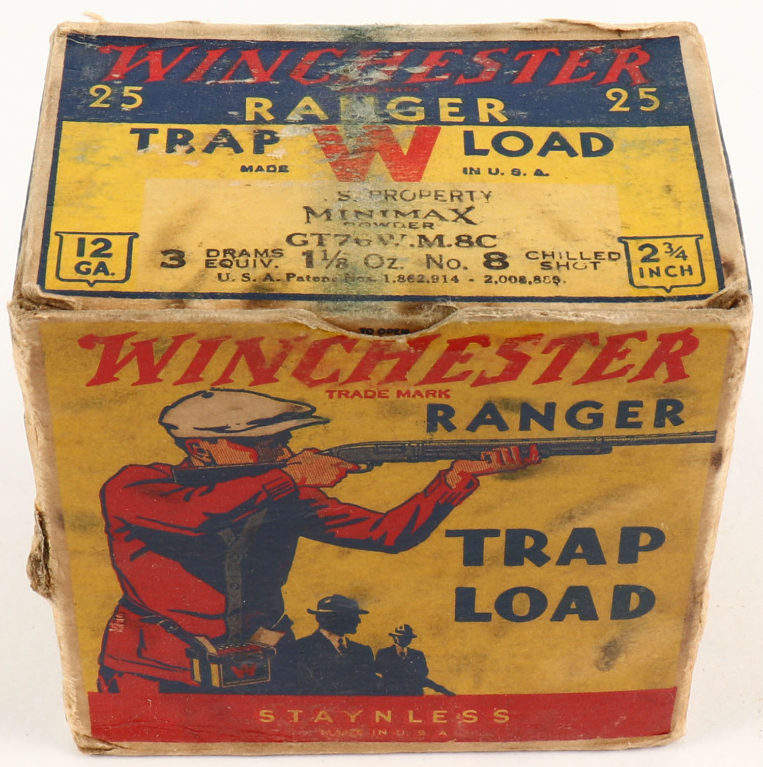 Winchester, Ranger TRAP LOAD, U.S. Property, 12ga., 1pc., Partial 23rds., shot size 8 Chilled Shot, yellow, blue & red box that pictures trap shooter, Box has age soiling, light shell protrusions, with very nice colors, shells are very good. Grade: Very Good + - Value: 40 to 200