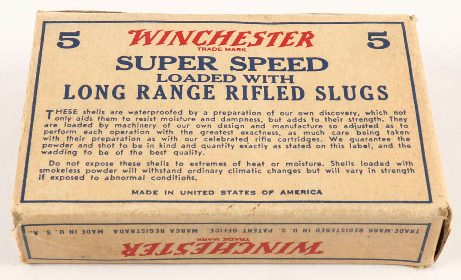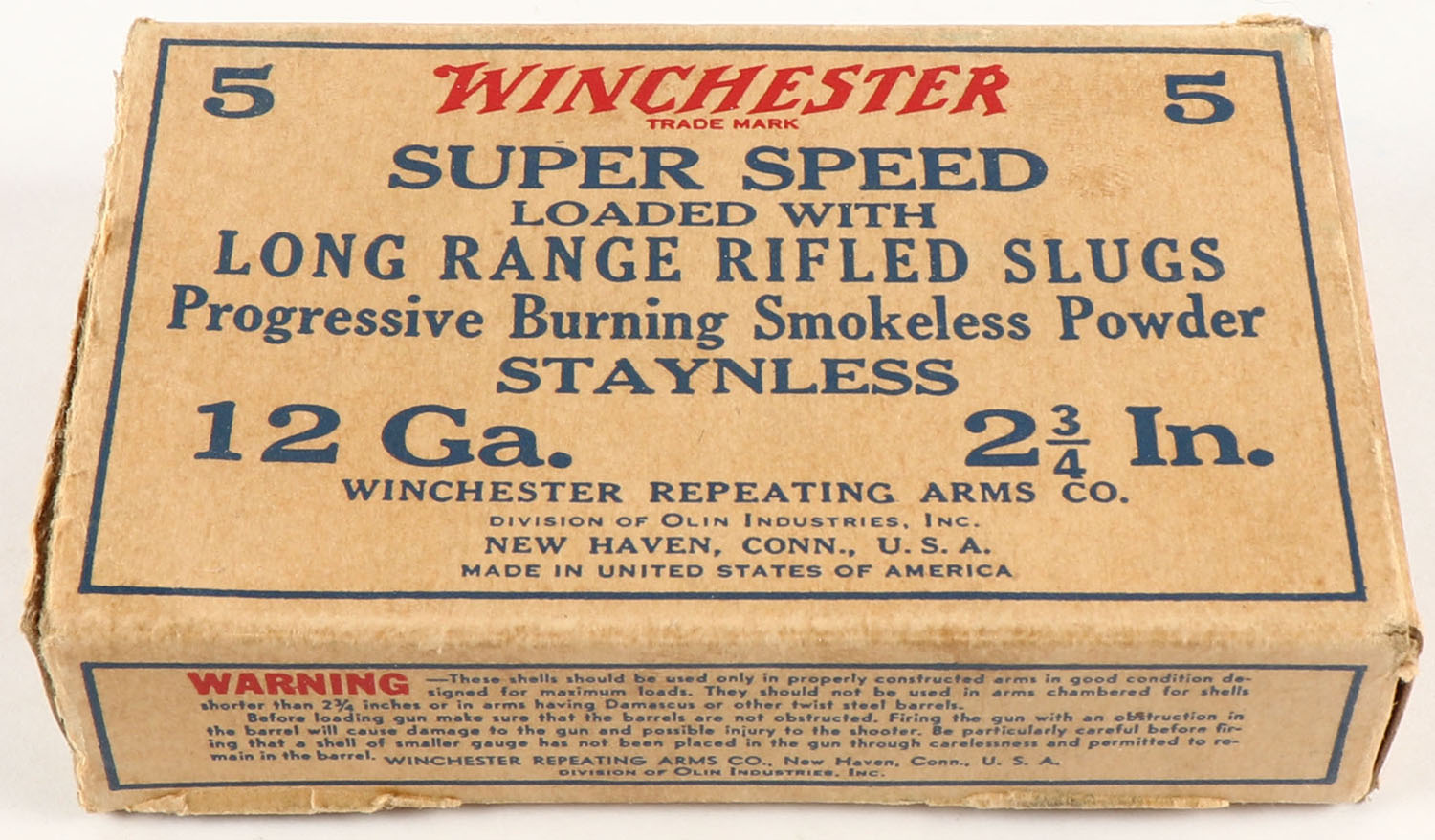 Winchester, Super Speed, STAYNLESS, 12ga., 2 3/4'', 1pc., Full, Rifled Slugs, Buff, blue & red box, box has torn end flap, paper shells are excellent. Grade: Very Good ++ - Value: 10 to 40