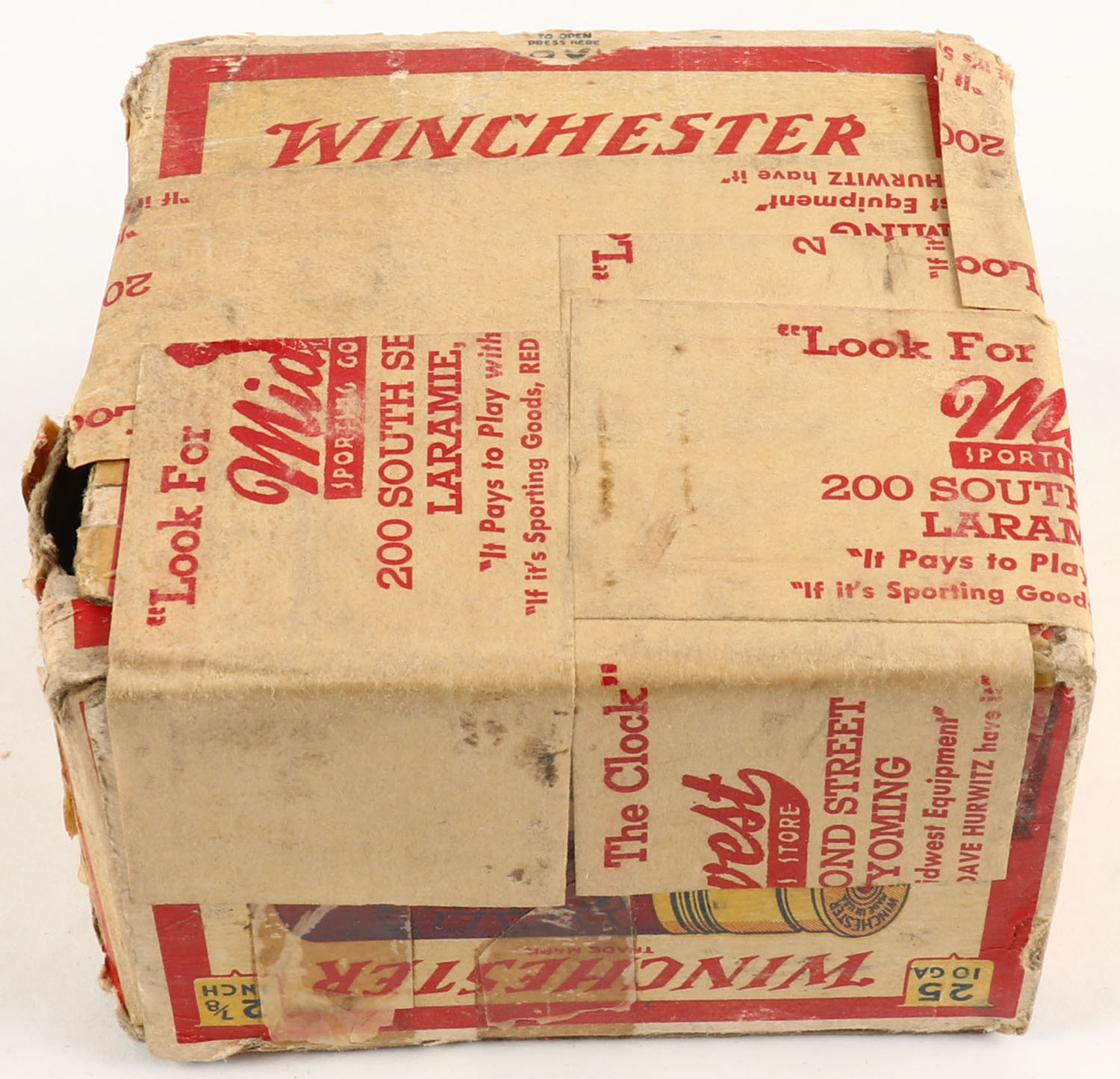 Winchester, Super W Speed, Staynless, 10ga., 2 7/8'', 1pc., Partial 24rds, shot size 4, cream red, blue and yellow box, box has taped wrapped around it, has shell protrusions with wear, paper shells are excellent. Grade: Good ++ - Value: 10 to 40