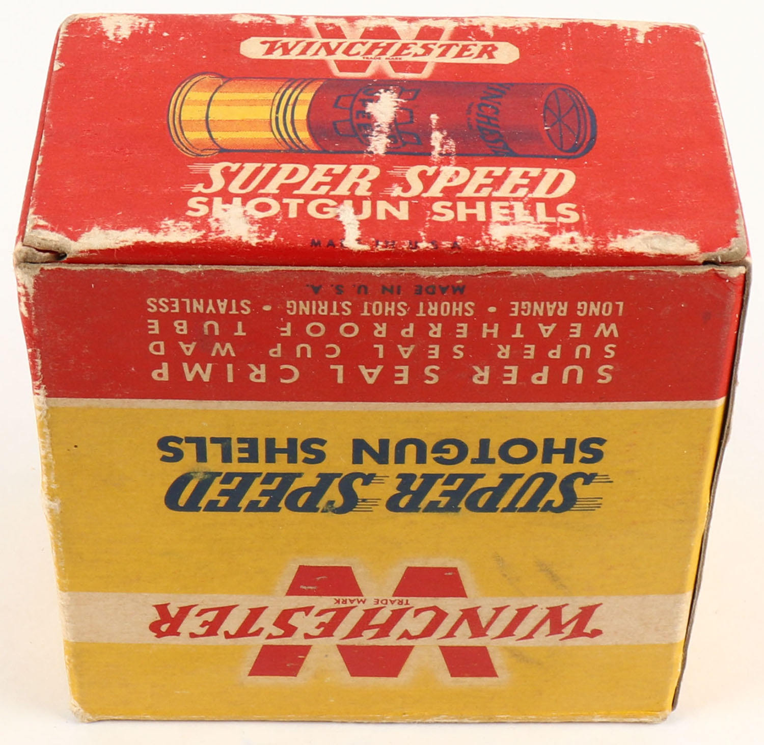 Winchester, Super Speed, 12ga., 2 3/4'', 1pc., Full, shot size 5, red, black and yellow box, box has light scuffing, paper shells are excellent. Grade: Excellent - Value: 10 to 40