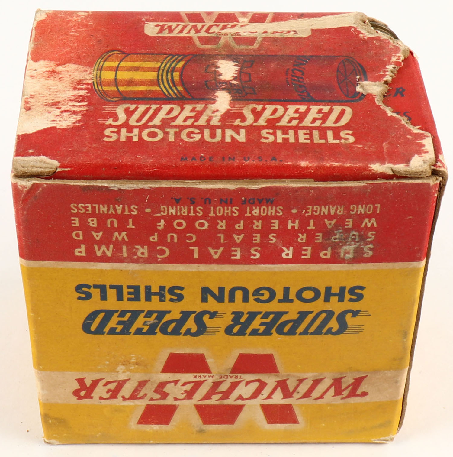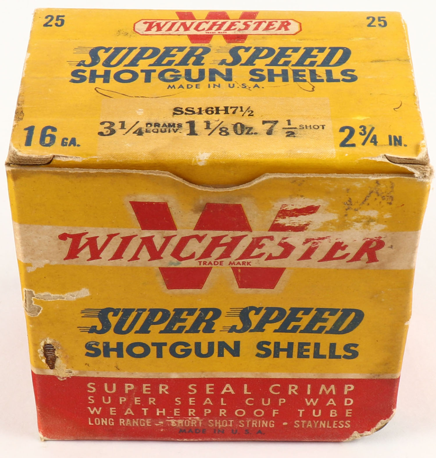 Winchester, Super Speed with Insert, 16ga., 2 3/4'', 1pc., Full, shot size 7 1/2, red, black and yellow box, box has soiling & scuffing, paper shells are very good. Grade: Good ++ - Value: 10 to 30