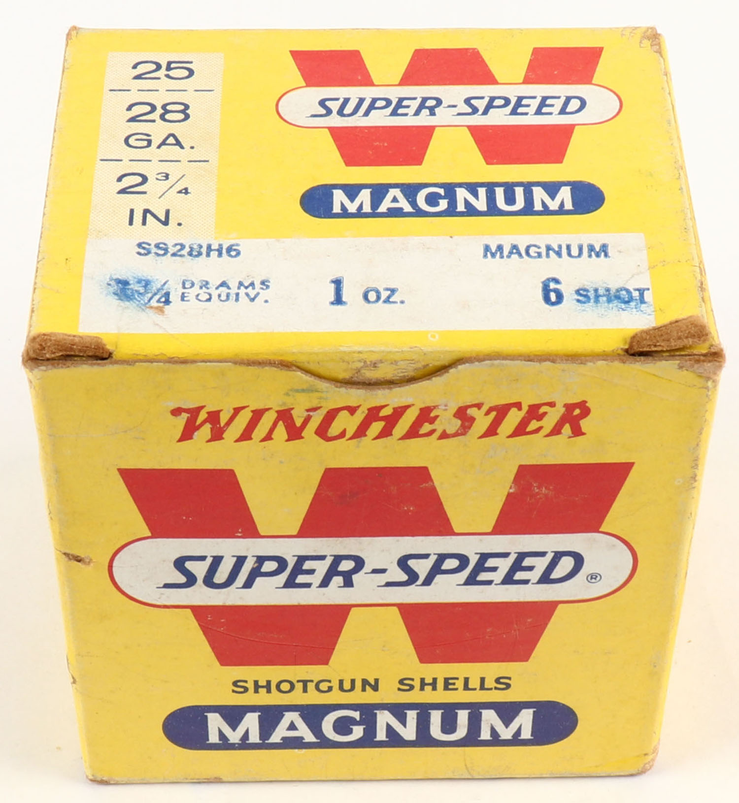 Winchester, Super Speed MAGNUM, 28ga., 1pc., Full, 2 3/4'', shot size 6, red, yellow & blue box, box has shelf wear with very nice colors, paper shells are excellent. Grade: Excellent - Value: 10 to 40