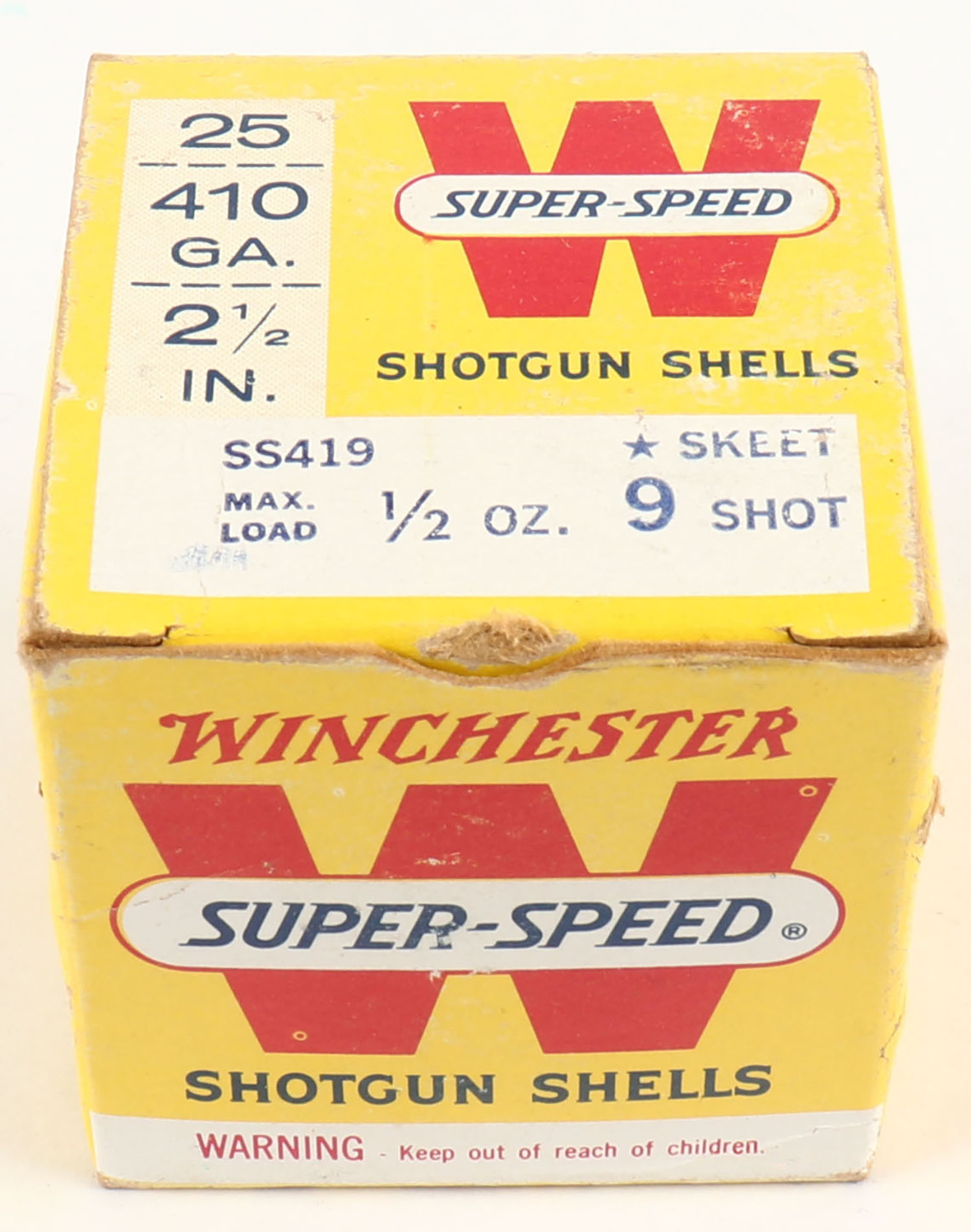 Winchester, Super Speed, 410ga., 2 1/2'', 1pc., Partial 24rds., shot size 9 Skeet, box has shelf wear with great color, paper shells are excellent. Grade: Very Good ++ - Value: 10 to 30