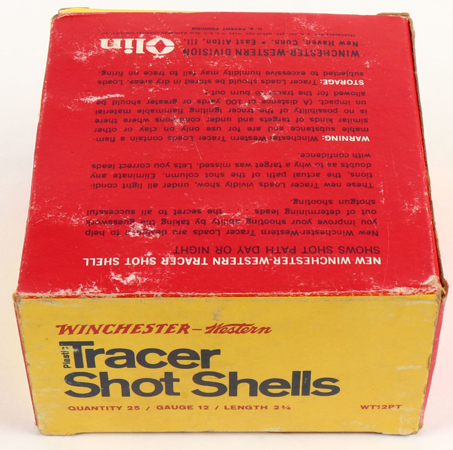Winchester-Western, Tracer Shot Shells, Visible Day or Night, 12ga., 2 3/4'', 1pc., Full, shot size 8, multi-colored box, box is very solid with minor scuffing, plastic shells are excellent. Grade: Very Good ++ - Value: 10 to 50