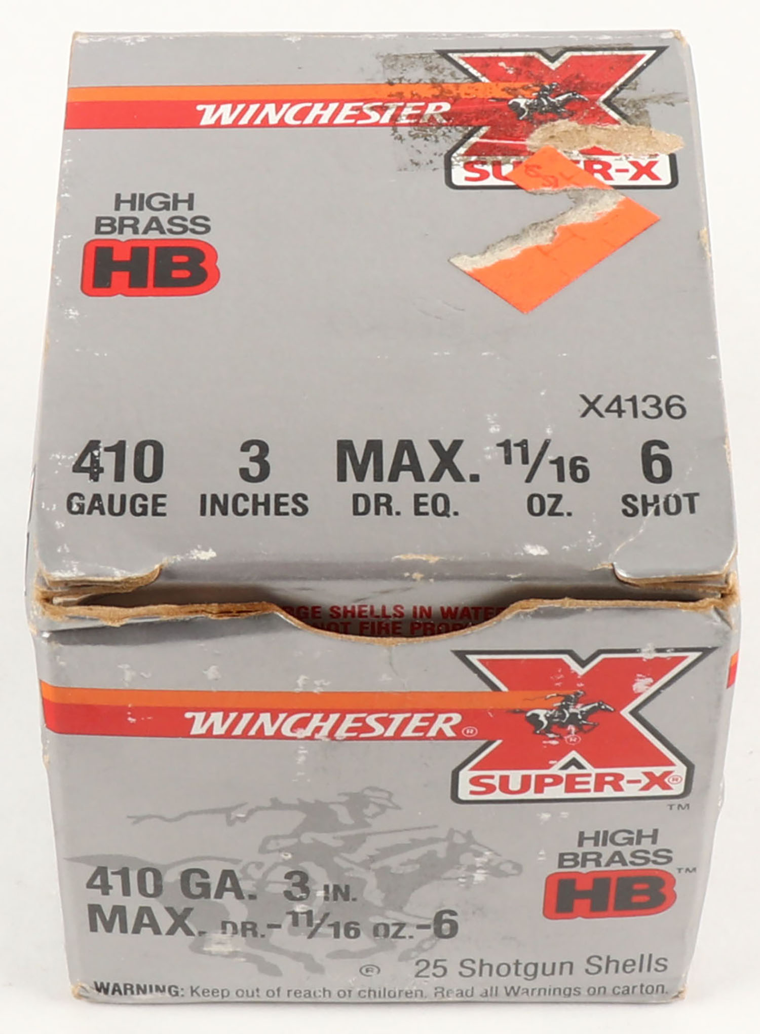 Winchester, Super-X High Brass, 410ga., 1pc., Full, shot size 6, box is solid with great color, plastic shells are excellent. Grade: Excellent - Value: 10 to 30