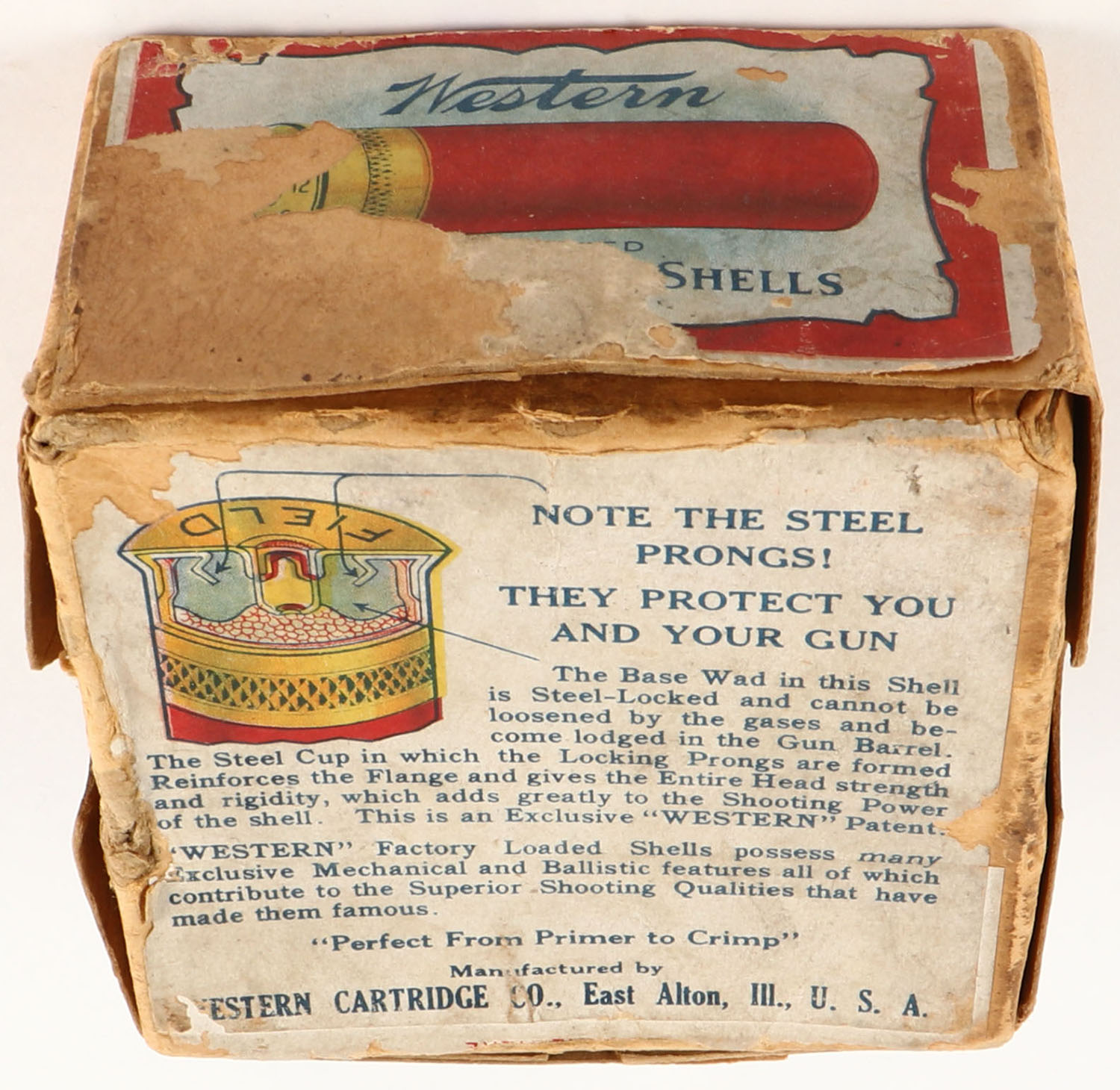 Western, Field, 12ga., 2pc, Empty, shot size 6, box has soiling & scuffing with edge wear.. Grade: Excellent - Value: 60 to 200
