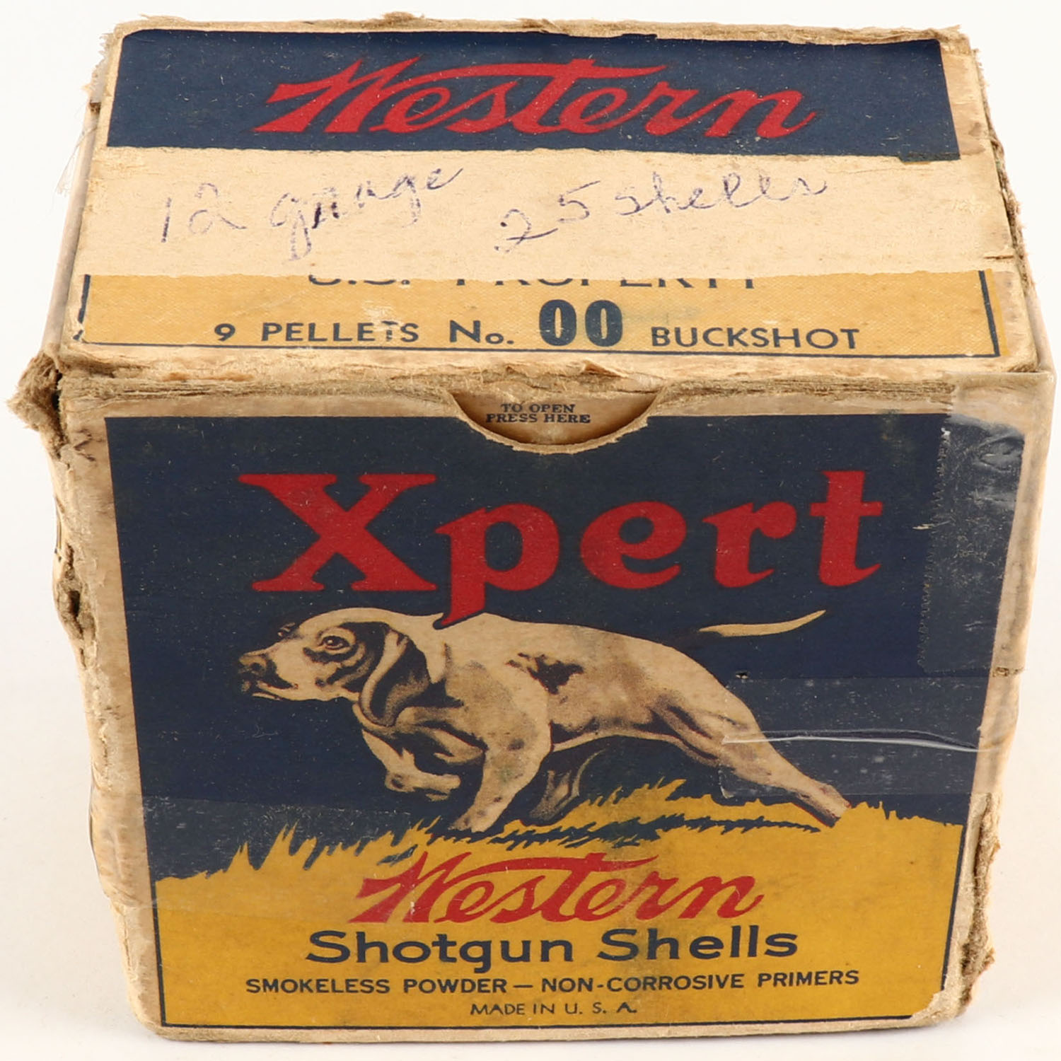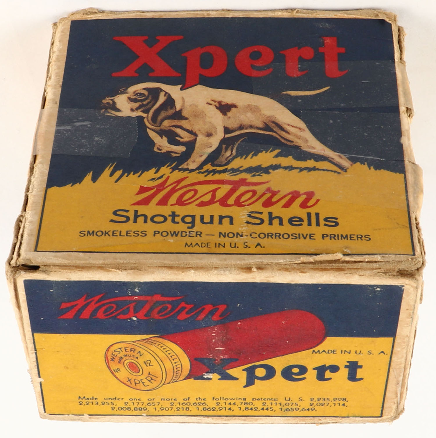 Western Cart. Co., Xpert, 12ga., 1pc., Partial 24rds., shot size 00 BUCK blue, yellow & red box with a dog on point, box has tape repairs with scuffing & edge wear, paper shells are excellent. Grade: Good ++ - Value: 50 to 150