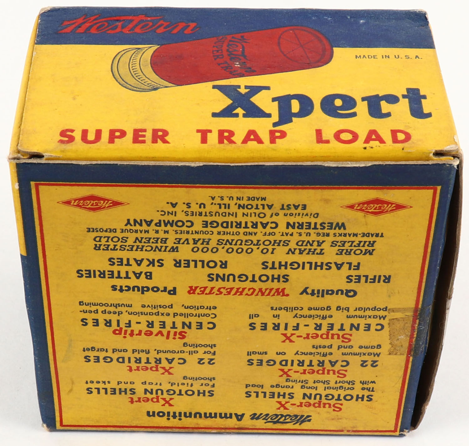 Western Xpert, Super Trap Load, 12ga., 1pc., Full, shot size 7 1/2, 2 3/4'', multi-colored box, box is very solid with light shelf wear and very nice color, paper shells are excellent. Grade: Excellent - Value: 10 to 30