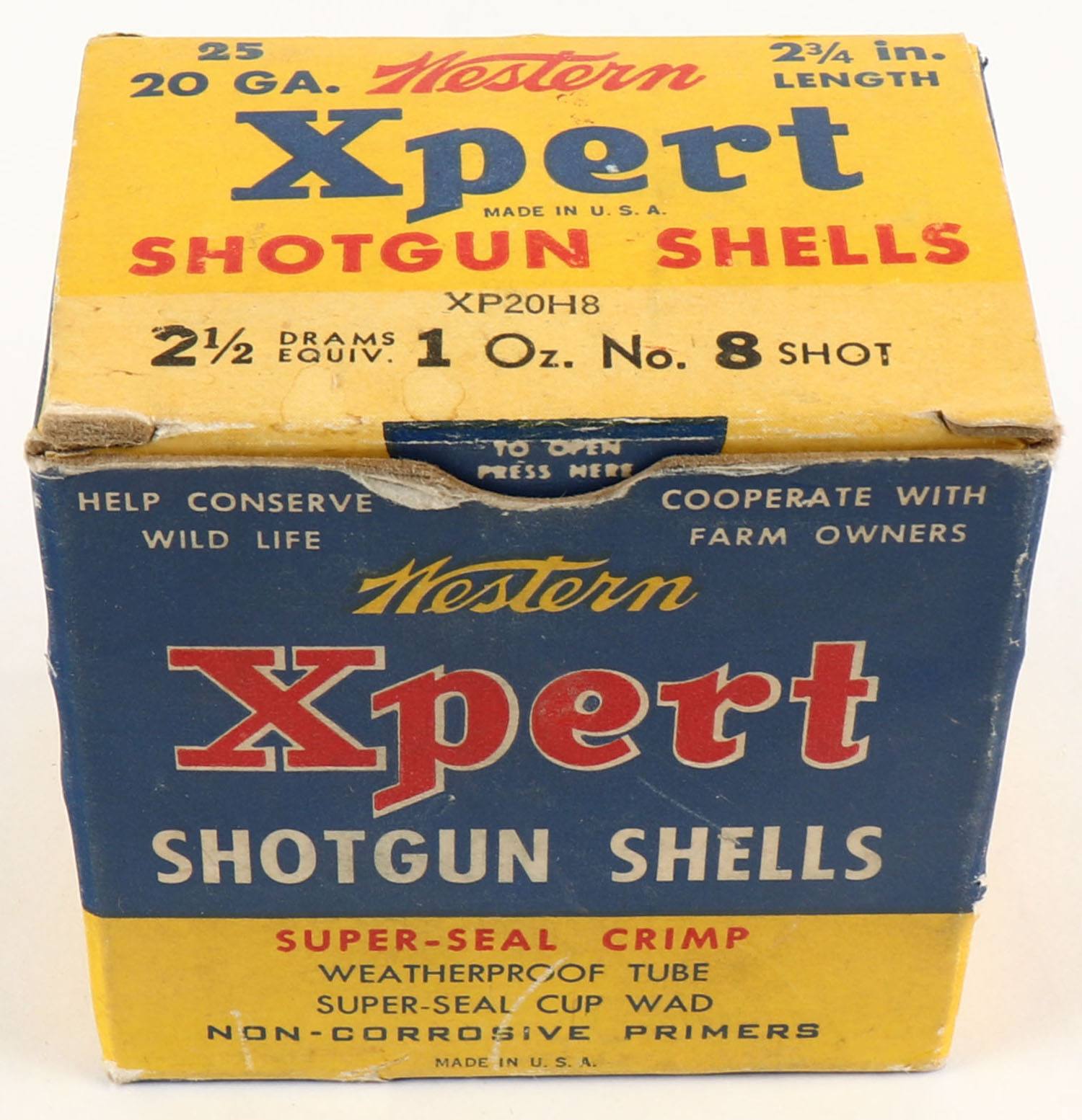 Western, Xpert, 20ga., 2 3/4'', 1pc., Full, shot size 8, multi-colored box, box is very solid with great colors, paper shells are excellent. Grade: Excellent - Value: 10 to 30
