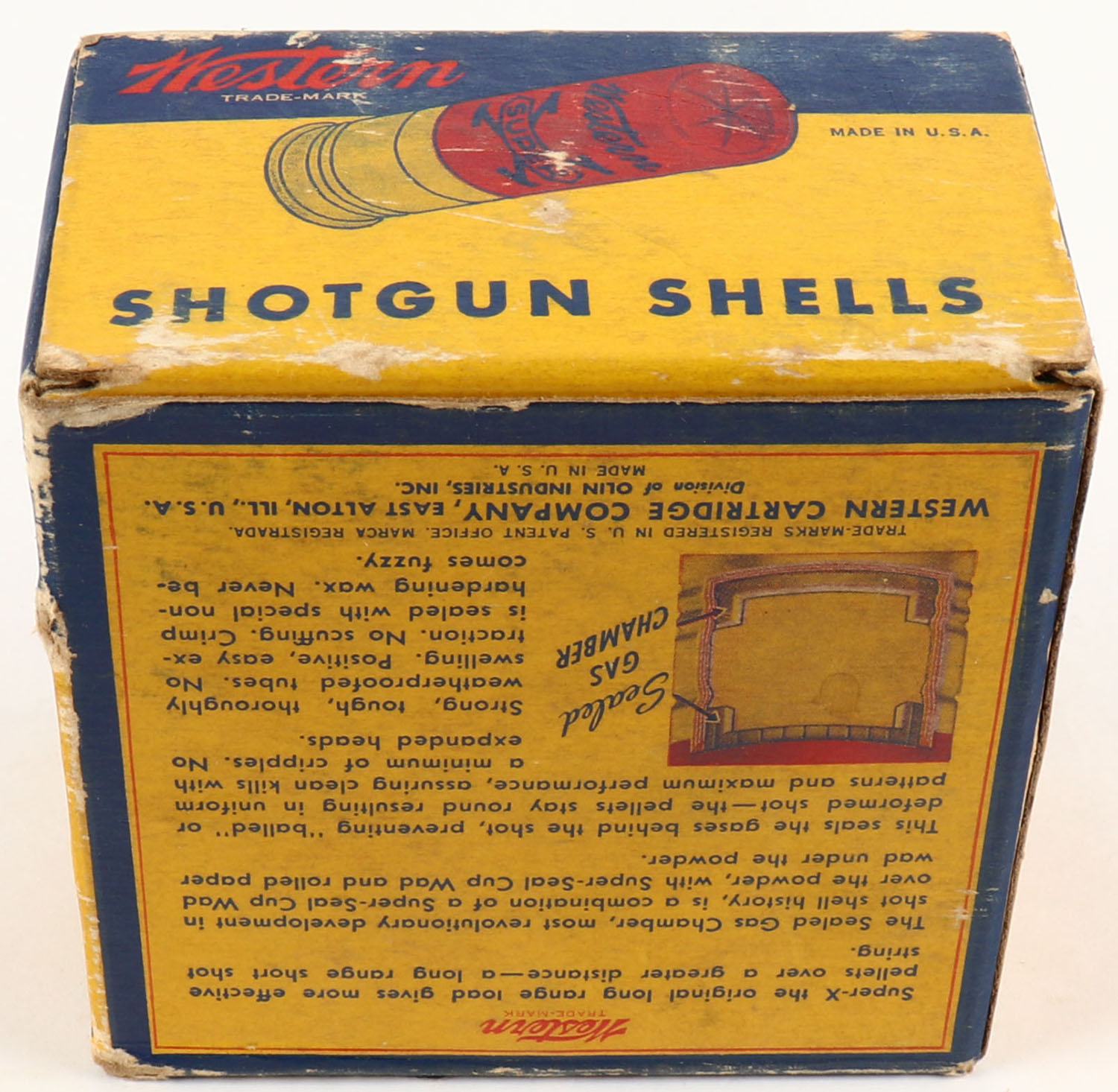 Western, Super X, 12ga., 1pc., Full, shot size 4, 2 3/4'', multi-colored box, box has light scuffing with great color, paper shells are excellent. Grade: Very Good ++ - Value: 10 to 30