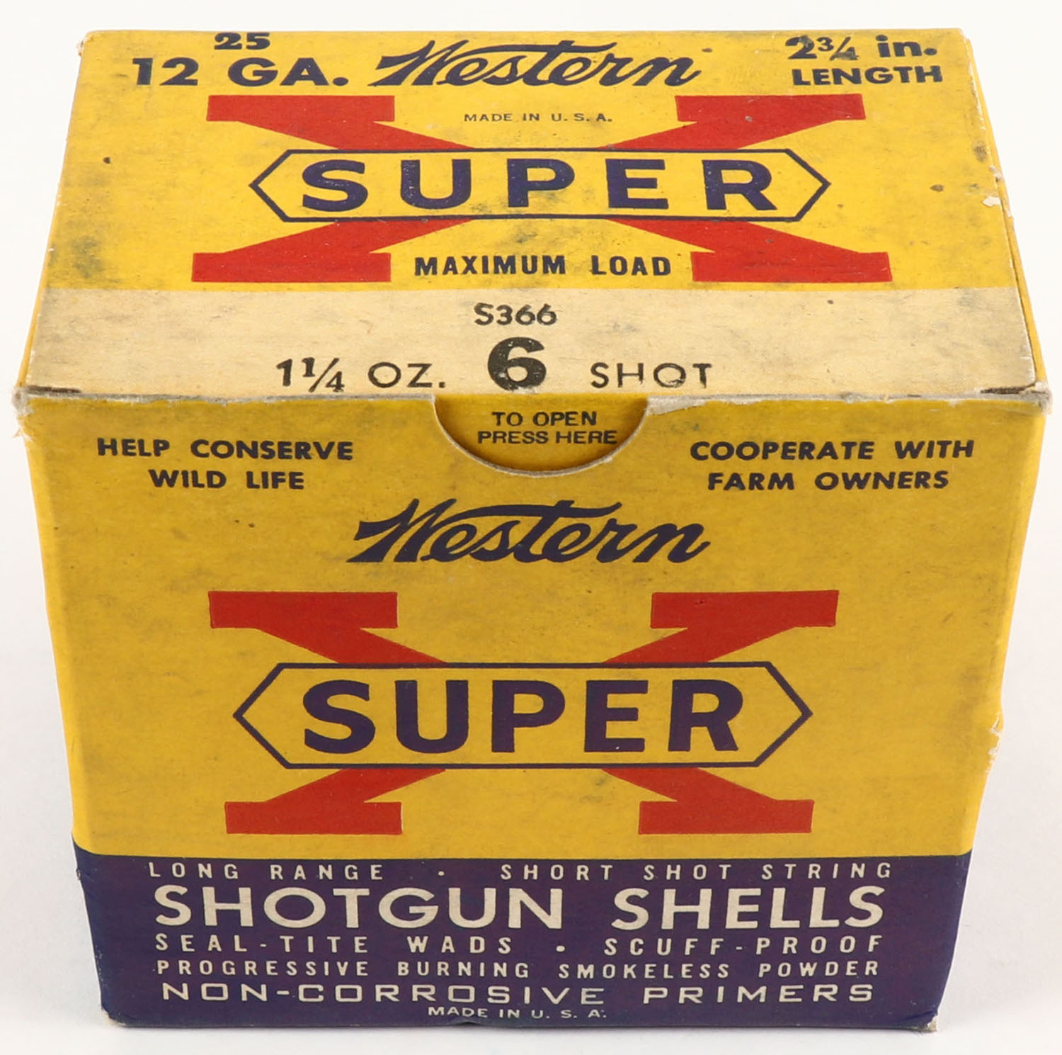 Western, Super X, 12ga., 1pc., Full, shot size 6, 2 3/4'', multi-colored box, box has light edge wear with very nice color, paper shells are excellent. Grade: Excellent - Value: 10 to 30