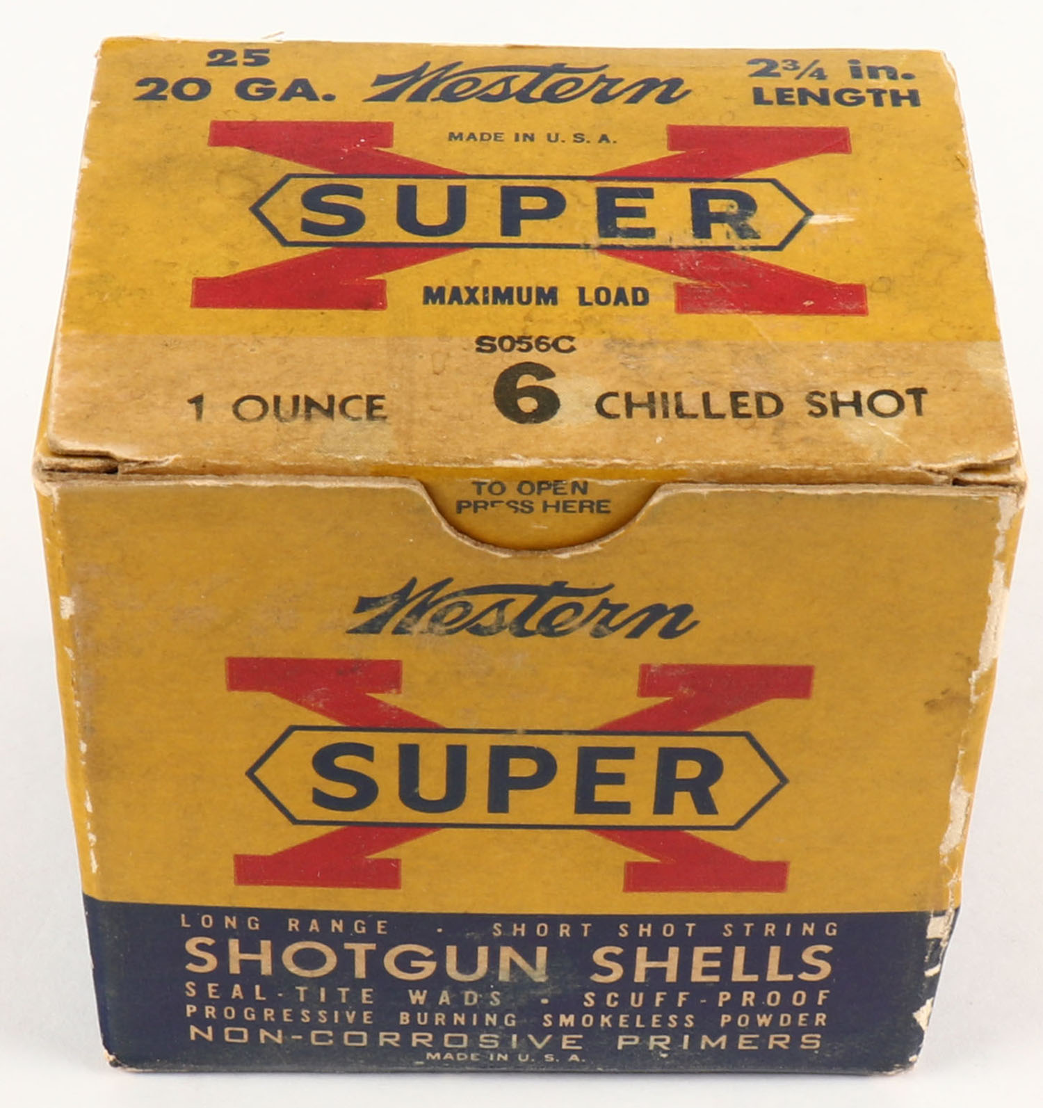 Western, Super X, 20ga., 2 3/4'', 1pc., Full, shot size 6CH, multi-colored box, box is solid with light age soiling, paper shells are excellent. Grade: Very Good ++ - Value: 10 to 30